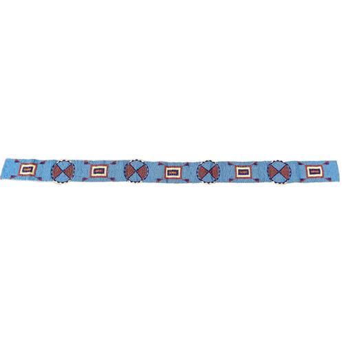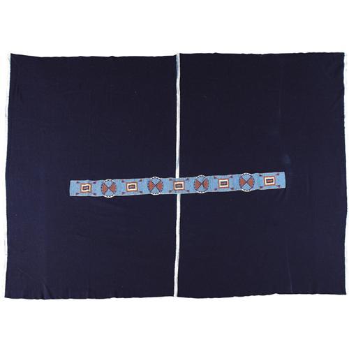 <B>Sioux Man's Wearing Blanket</B></I><BR>Circa 1890<BR>Length 68 1/2 in. Width 99 in.<BR><BR>This "skunk" blanket is fashioned from two pieces of navy blue wool cloth with white selvage. The term is an obvious reference to the wide, central stripe created by the bands of white selvage. These blankets are also referred to as "courting" blankets. Courtship scenes are commonly depicted in ledger art with a man and a woman enveloped in a similar blanket. The center of the blanket is decorated with a beaded strip, sinew sewn on hide, then stitched to the blanket. The blanket strip is composed of five panels and four rosettes. The panels are decorated with an <I>u-ma-ne</B></I> symbol in red, yellow, navy blue, amber, and metallic beads against a blue bead background. The <I>u-ma-ne</B></I> symbol, frequently seen in Sioux beadwork and quillwork, represents the unappropriated life or power of the earth (which man may obtain). The square or oblong with four radiating lines is interpreted to represent the earth and the four directions. The rosettes are divided into quadrants, alternating in red and blue, outlined in navy blue.<BR><BR>Provenance<BR>Bonhams and Butterfields, Sale 7477E, Lot 3275, December 8, 2003.<BR><BR>Reference<BR>Dorsey, James O., "A Study of Siouan Cults" <I>Eleventh Annual Report of the Bureau of Ethnology 1889-1890,</B></I> Smithsonian Institution, Washington, D.C., p. 451.<BR><BR>