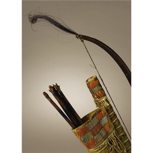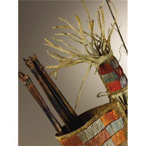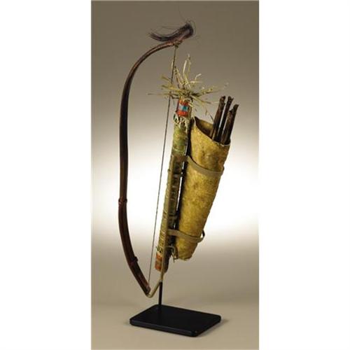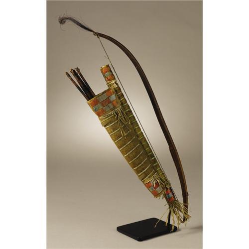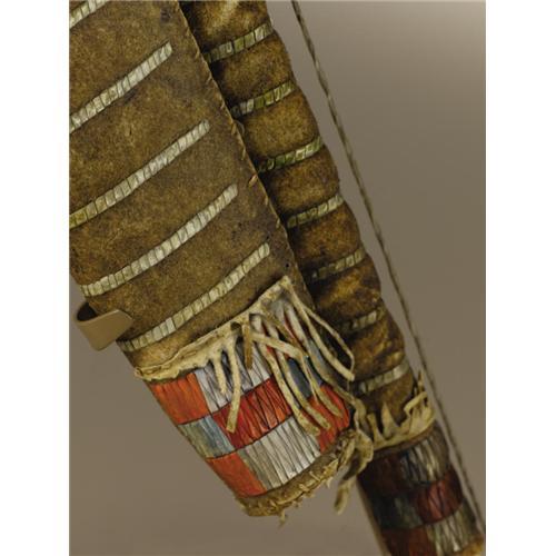 <B>Sioux Miniature Bow Case and Quiver</B></I><BR>Circa 1865<BR>Length of bow case 12 in.; Length of quiver 9 in.; Length of bow 16 in.<BR>Length of arrows 11 1/2 in.<BR><BR>This rare example is made of native tanned buffalo hide and decorated with fine porcupine quillwork. The top and bottom of both the bow case and quiver are decorated with quilled panels. The intervening space is filled with narrow, single lines of quillwork. The set is complete with a miniature wood bow with sinew bowstring and five miniature arrows. The set is a faithful recreation of a full scale ensemble. It was likely made for a warrior's favored son.<BR><BR>Provenance<BR>Gallery West, Tucson, Arizona.<BR><BR>