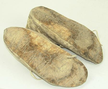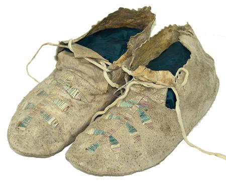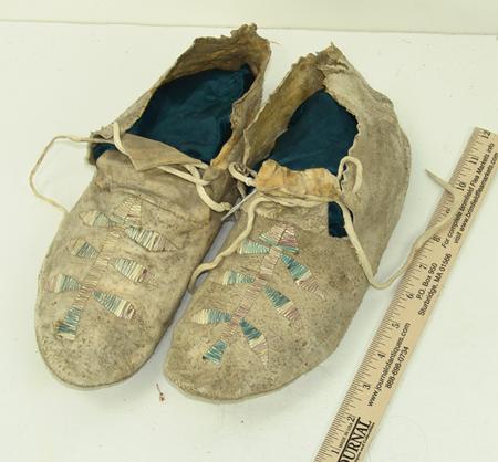 Circa Early 1900s, Classic old pair of light colored elkhide  moccasins with quilled floral designs and rawhide  soles, sinew sewn.  Very good condition. 10-1/2    From the Johnson Collection.