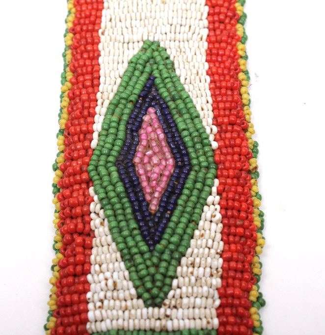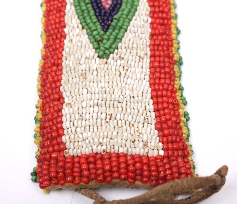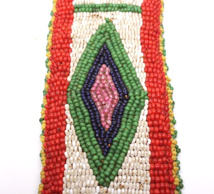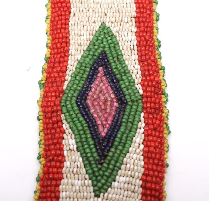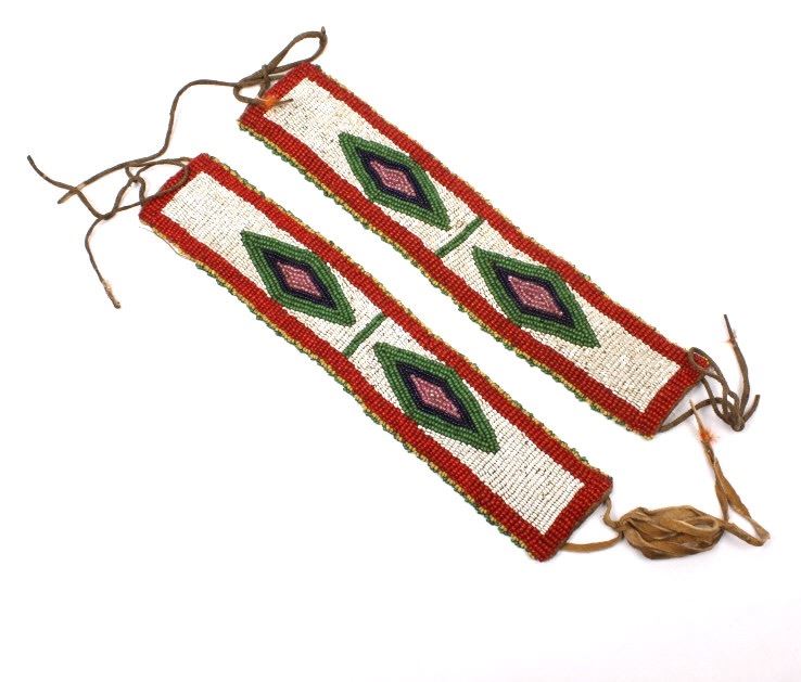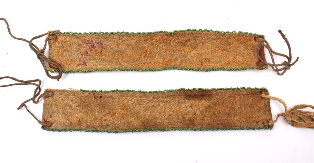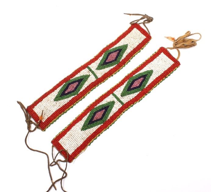 Available for your bidding pleasure we have a wonderful matched set of fully beaded Sioux Native American arm bands. The arm bands are are constructed from Great American Bison Buffalo Indian tanned hide that is fully decorated with glass trade seed beads in a traditional geometric pattern having a fancy beaded edge. The set shows very good condition. The measure 10" by 2".