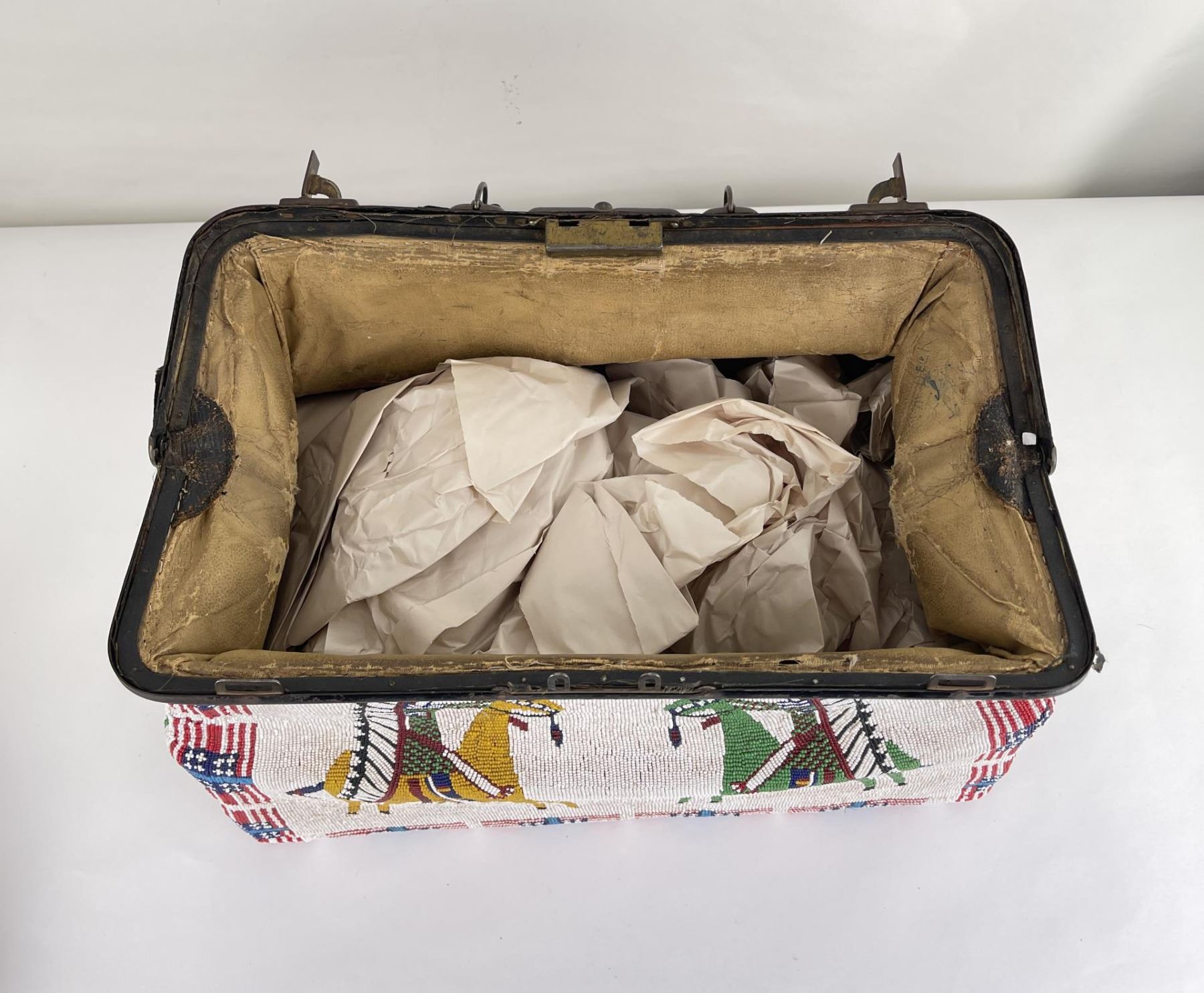 Inside of bag says S.M. Dick Lily South Dakota. 15 1/2", 7 7/8" long, 7 3/4" wide. Very nice ornate and fully beaded bag. Allard Auction Collection Inv: AX