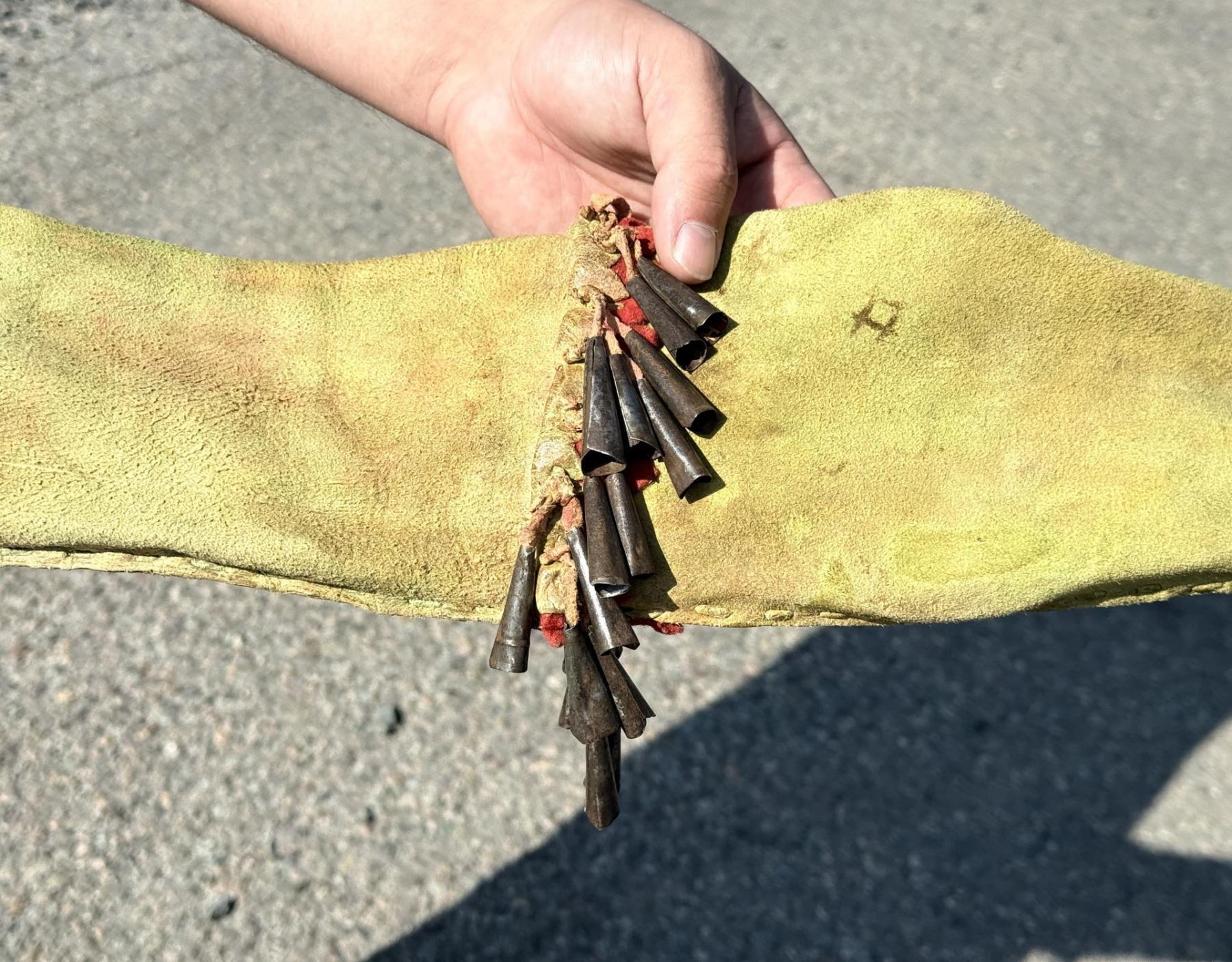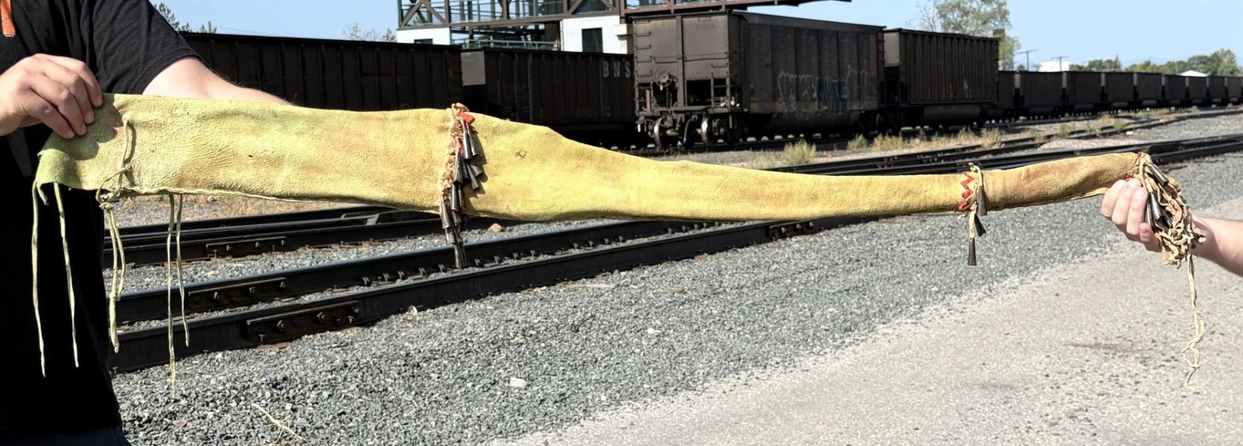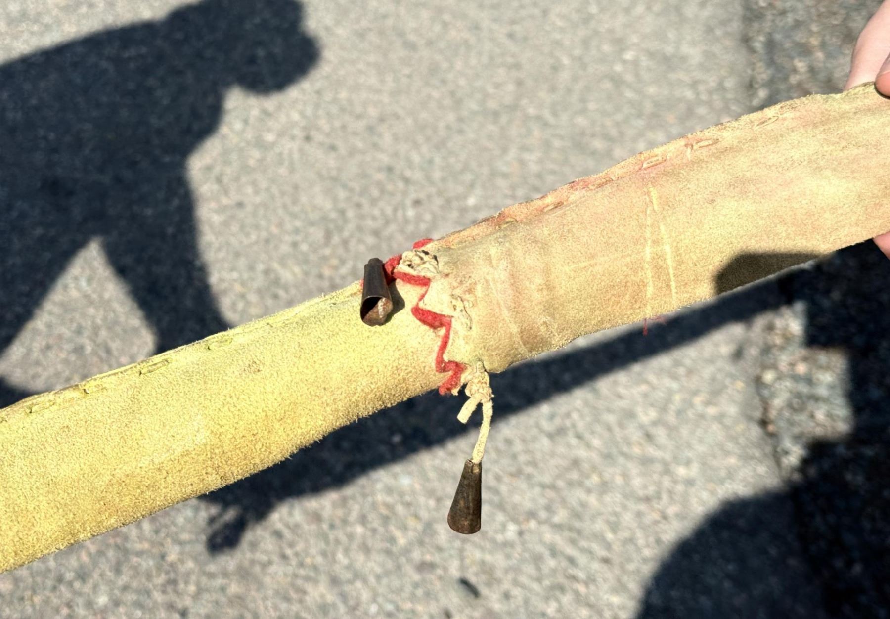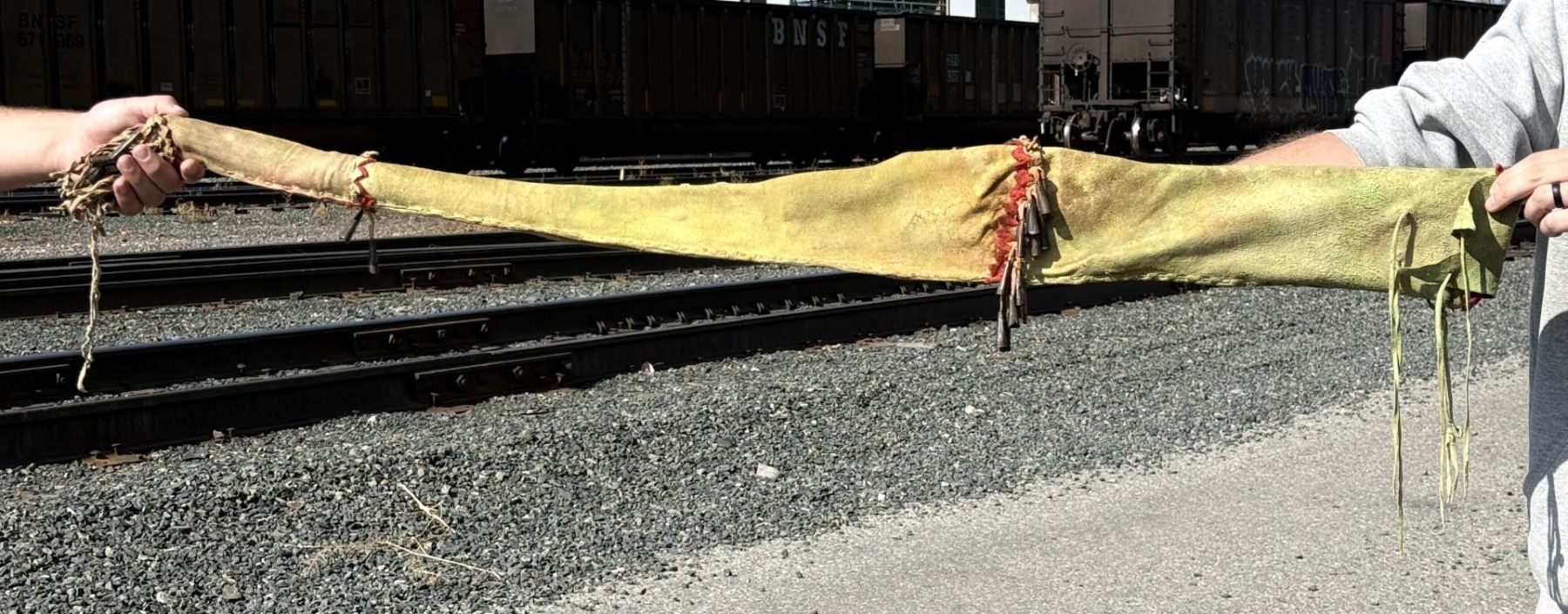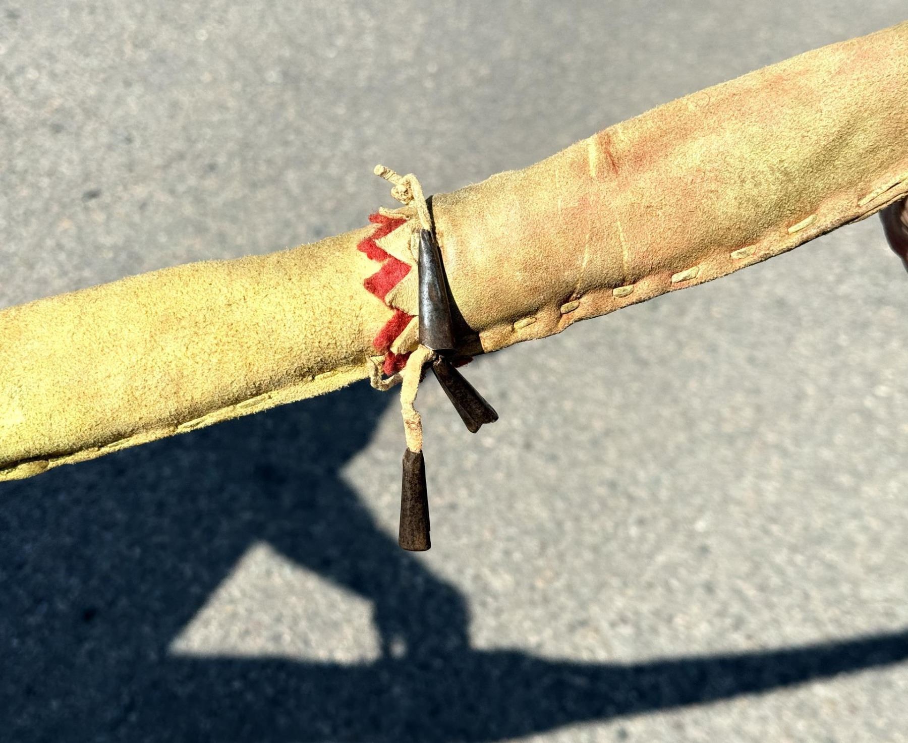 Exceptional Early Indian Scabbard. 60" long with fringe. 5" wide. Green and Red Ochre Painted with Tin Cones. Third Quarter of the 19th Century.
