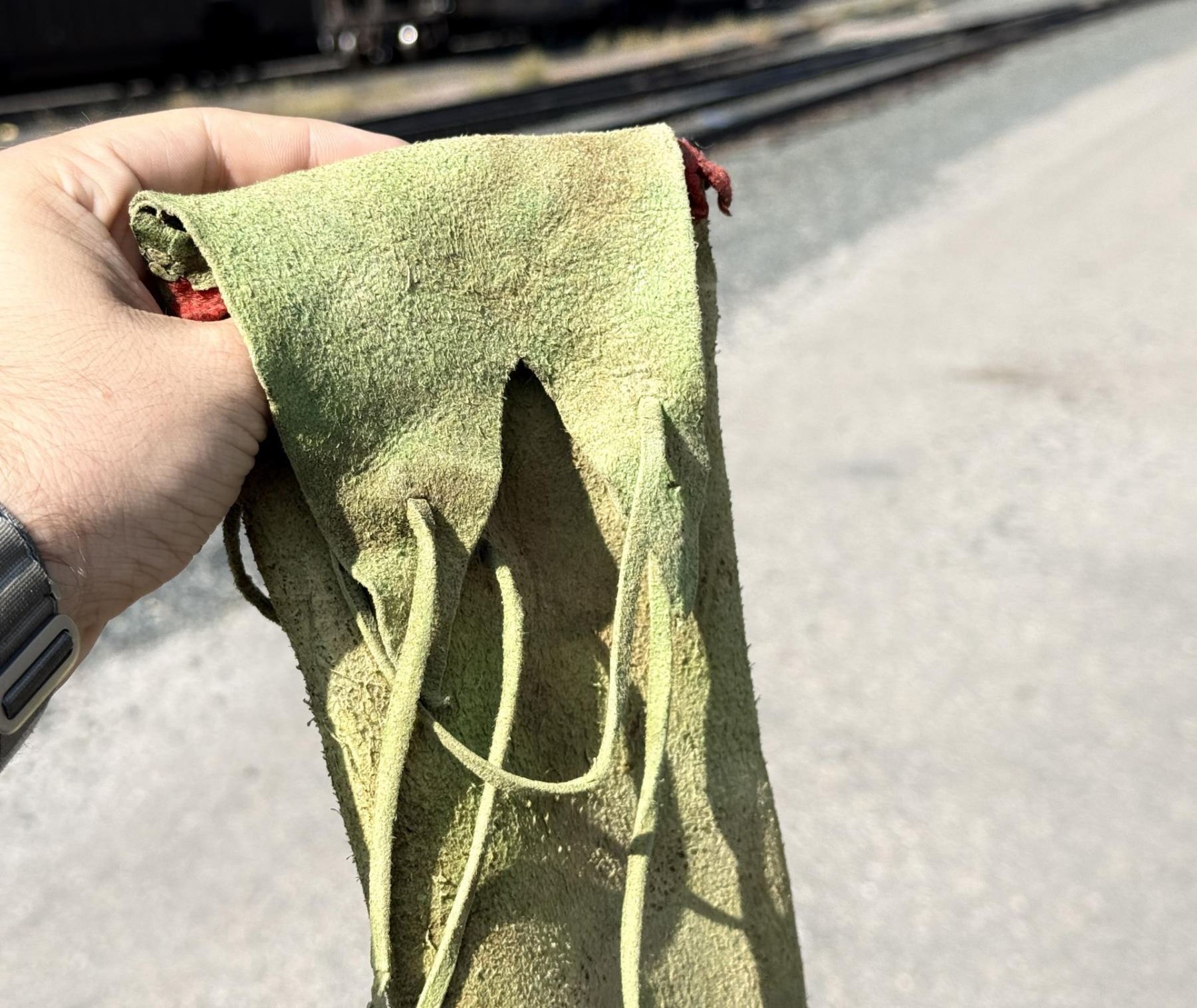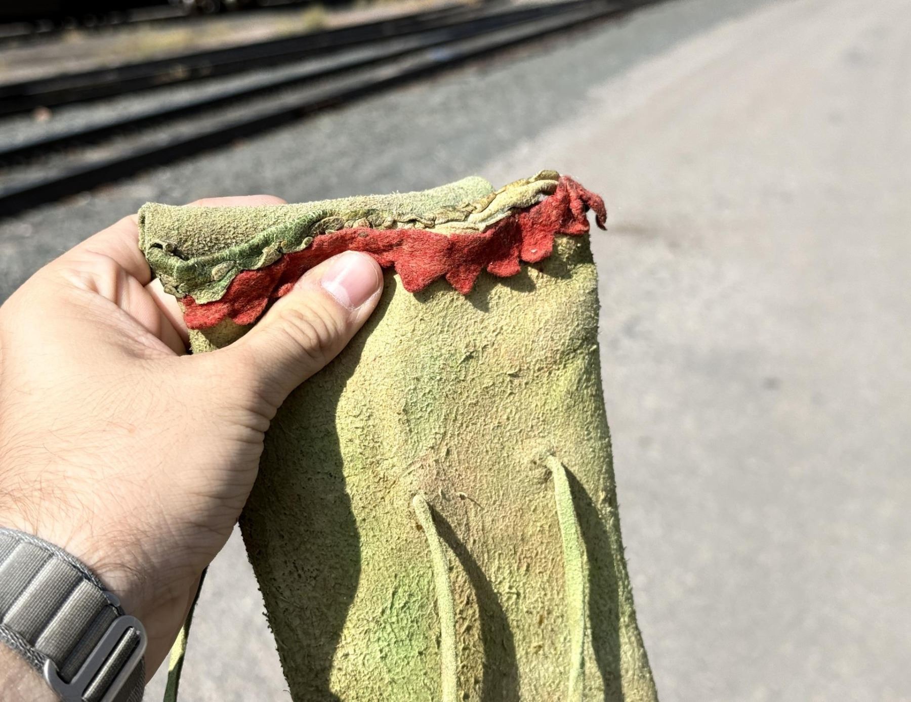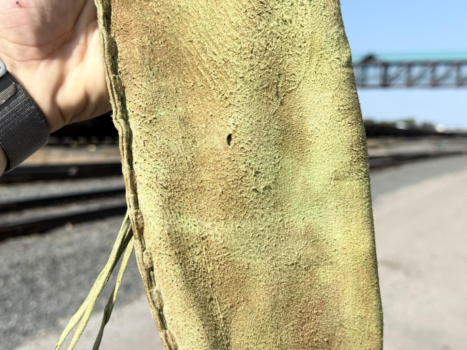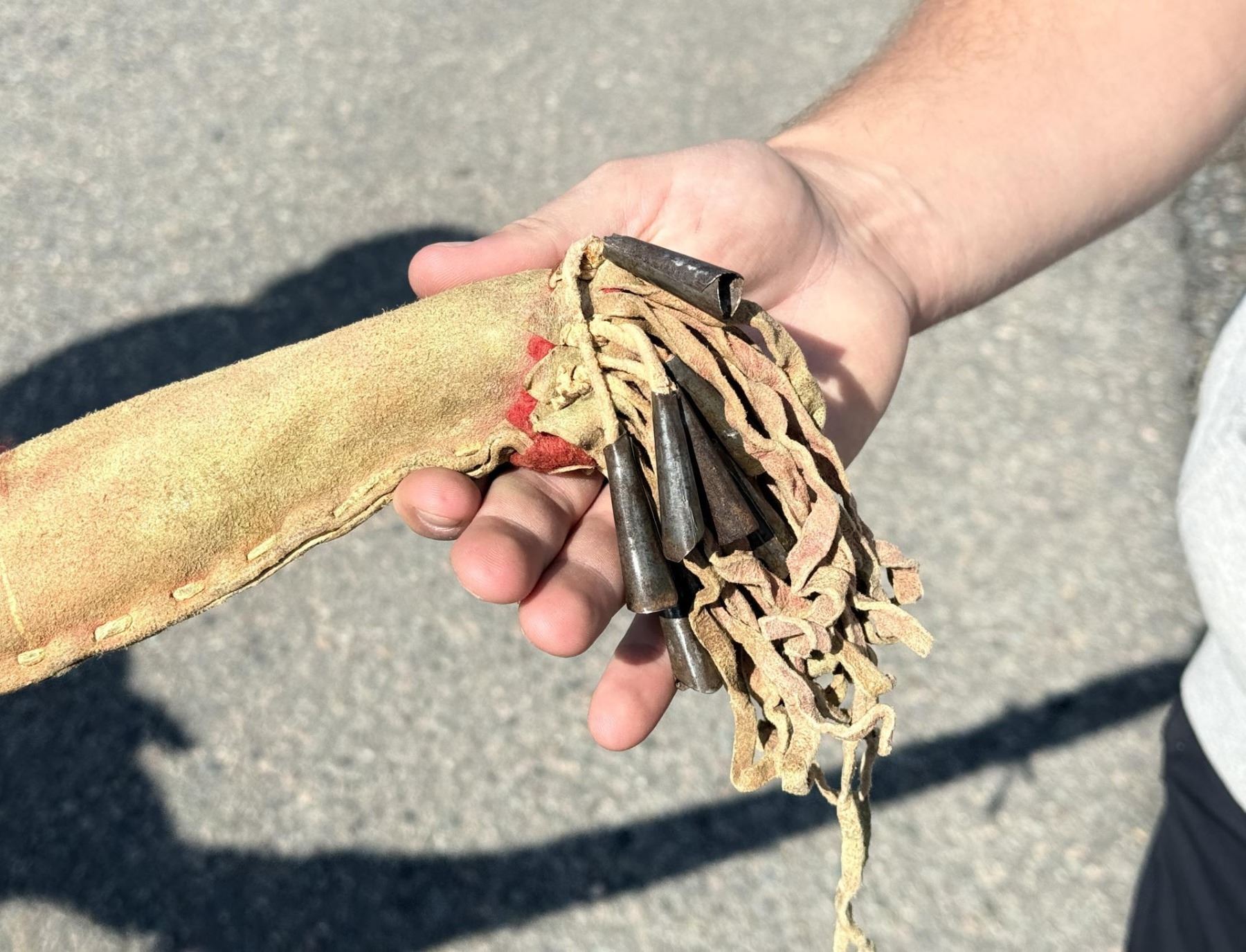 Exceptional Early Indian Scabbard. 60" long with fringe. 5" wide. Green and Red Ochre Painted with Tin Cones. Third Quarter of the 19th Century.