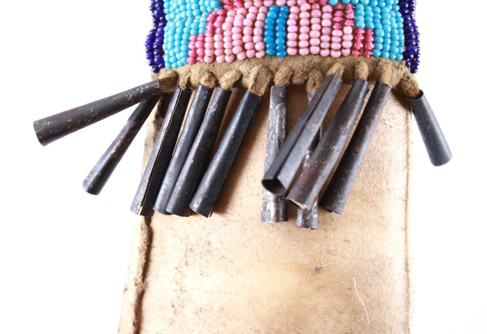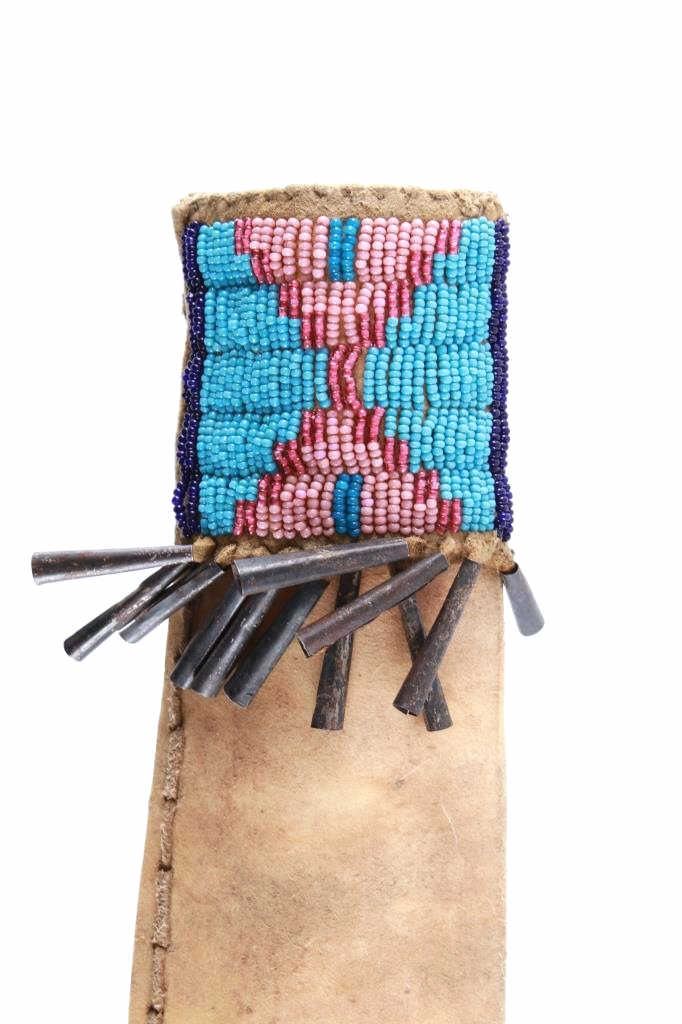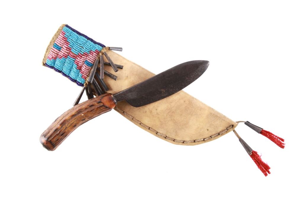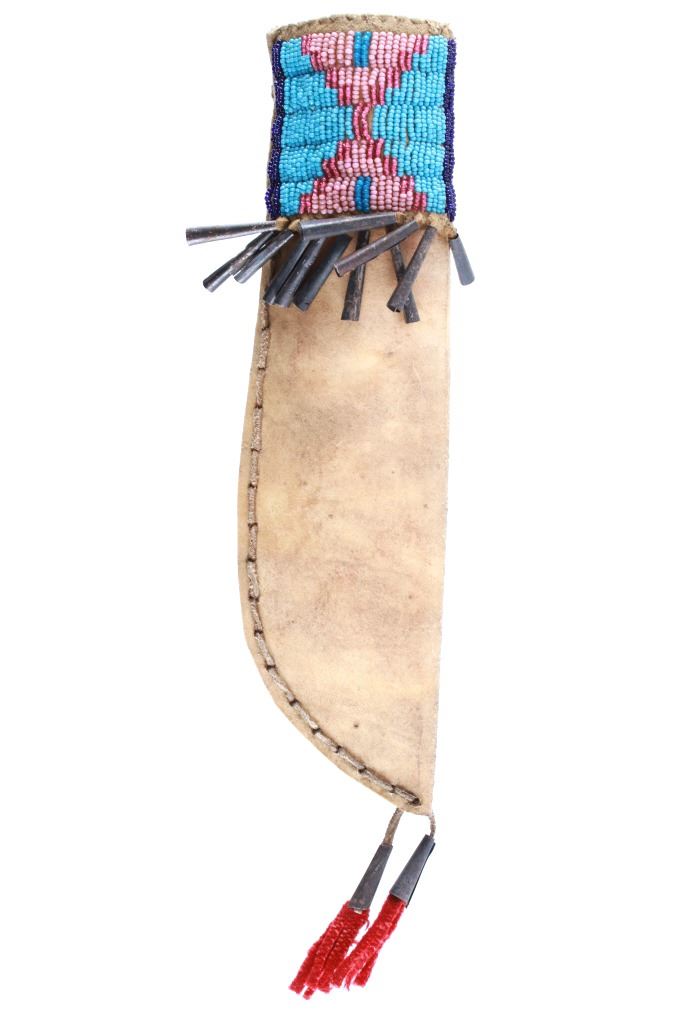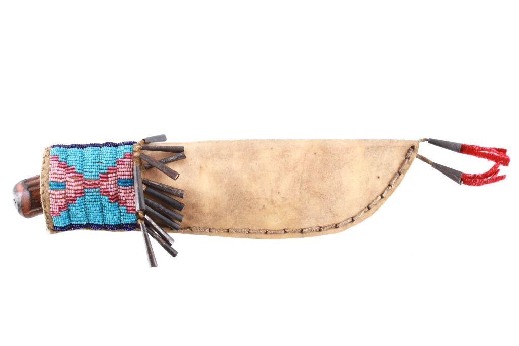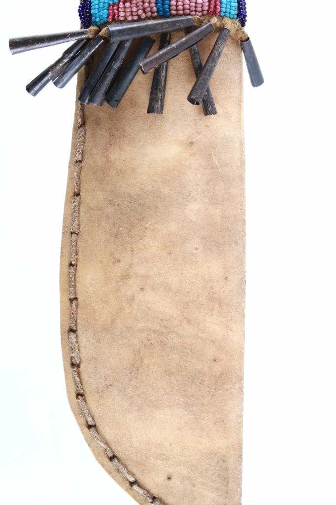The lot features a parfleche beaded sheath with old rasp file stag handled knife, both attributed to the Sioux Native American Indians of the Plains. The knife shows a rasp file, which has been fashioned into a nice heavy knife and is set into the Stag antler with poured led pewter and is peened over at the end. The antler horn has a dark red to brown coloring with yellowing, an honest antique, 1800's patina. The sheath is parfleche rawhide with hide lacing sewing and an Indian tanned wrapping at the top, which is trade thread sewn on and has excellent geometric glass trade seed beadwork. The beadwork shows Cheyenne pink, light blue, semi-transparent pink, greasy blue, and cobalt. Below the beadwork is Indian hide tied with rolled tin jingle dangle cones. At the base are two Indian hide ties with rolled tin jingle dangle tones with red stroud wool fringes. The back of the sheath has the original Indian hide tie. Truly a fantastic pairing. The knife measures overall 8.75" L with the sheath being 15.5" L with fringe and tie strap.