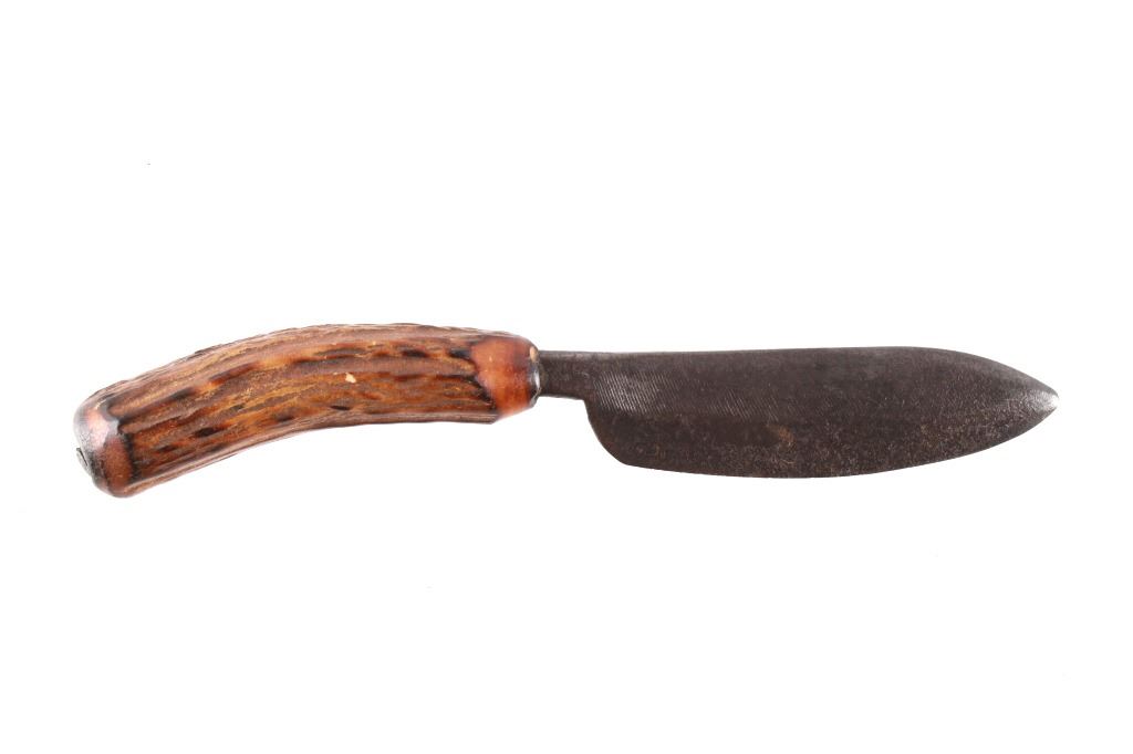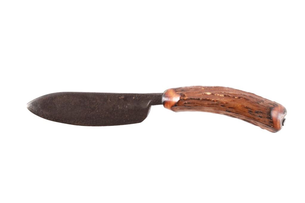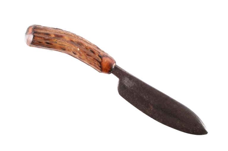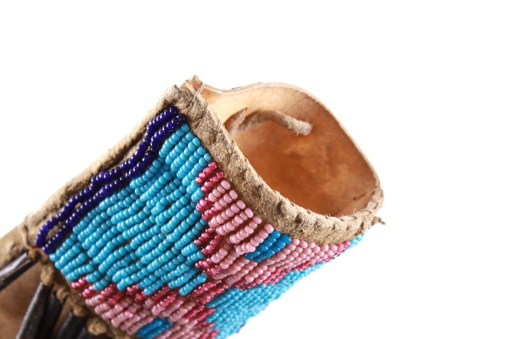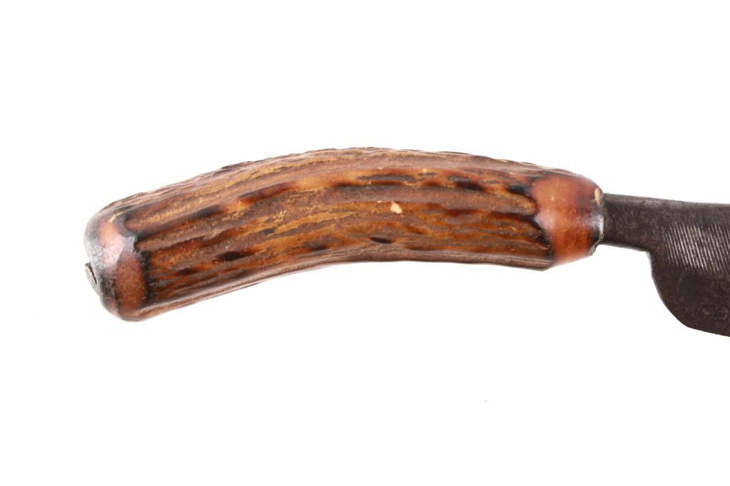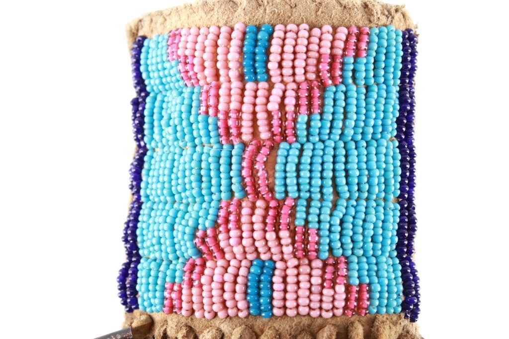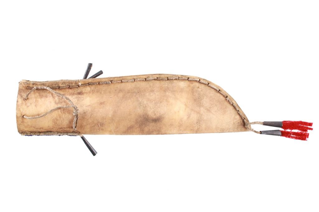 The lot features a parfleche beaded sheath with old rasp file stag handled knife, both attributed to the Sioux Native American Indians of the Plains. The knife shows a rasp file, which has been fashioned into a nice heavy knife and is set into the Stag antler with poured led pewter and is peened over at the end. The antler horn has a dark red to brown coloring with yellowing, an honest antique, 1800's patina. The sheath is parfleche rawhide with hide lacing sewing and an Indian tanned wrapping at the top, which is trade thread sewn on and has excellent geometric glass trade seed beadwork. The beadwork shows Cheyenne pink, light blue, semi-transparent pink, greasy blue, and cobalt. Below the beadwork is Indian hide tied with rolled tin jingle dangle cones. At the base are two Indian hide ties with rolled tin jingle dangle tones with red stroud wool fringes. The back of the sheath has the original Indian hide tie. Truly a fantastic pairing. The knife measures overall 8.75" L with the sheath being 15.5" L with fringe and tie strap.
