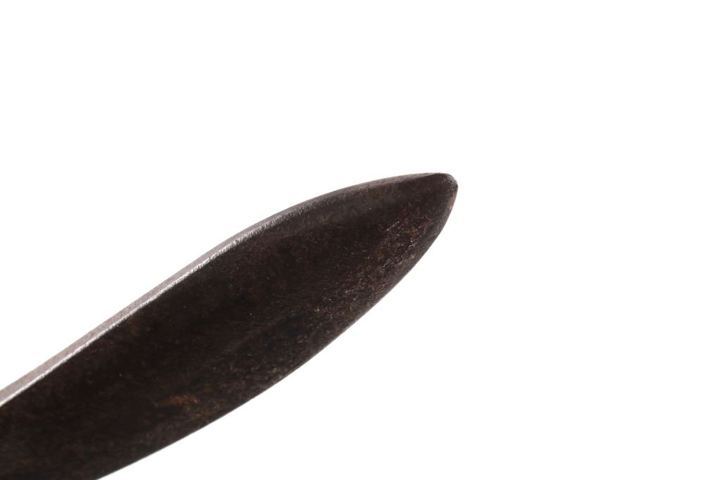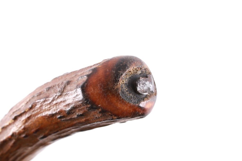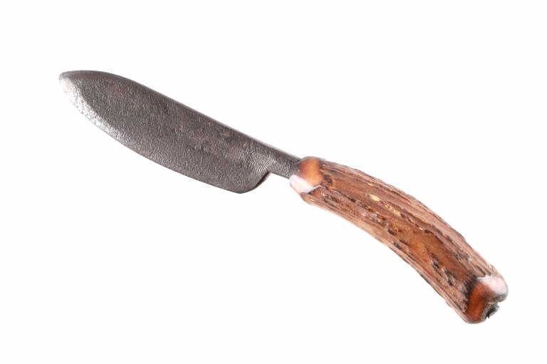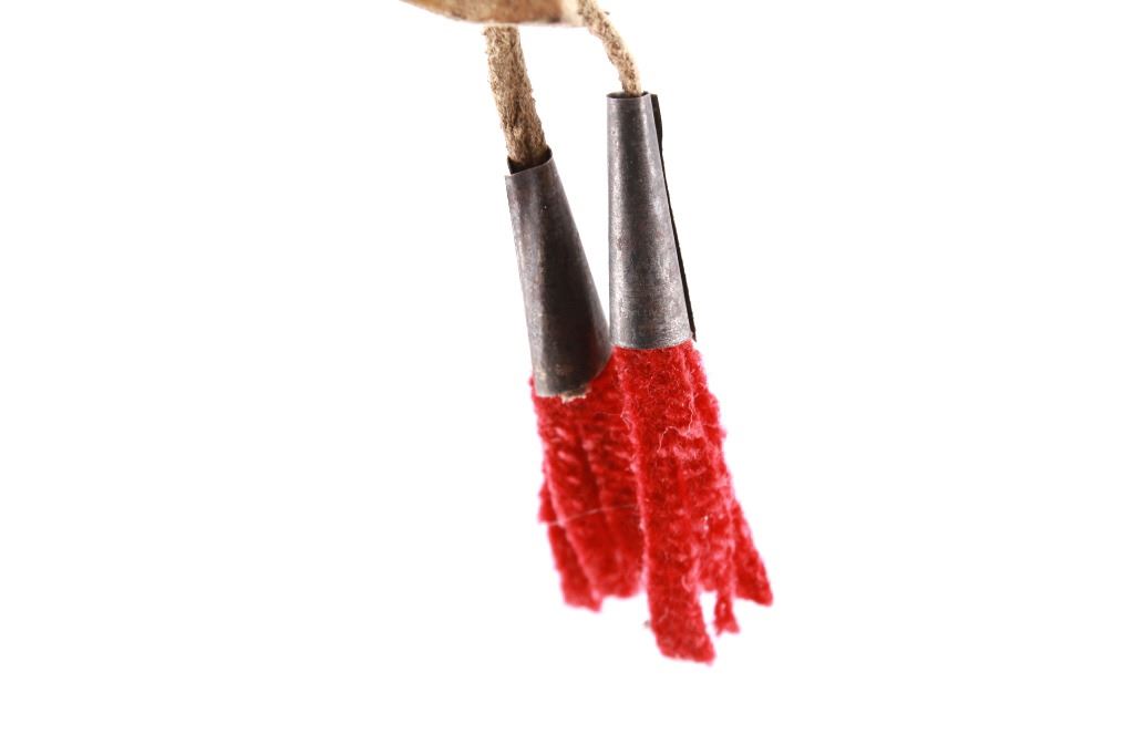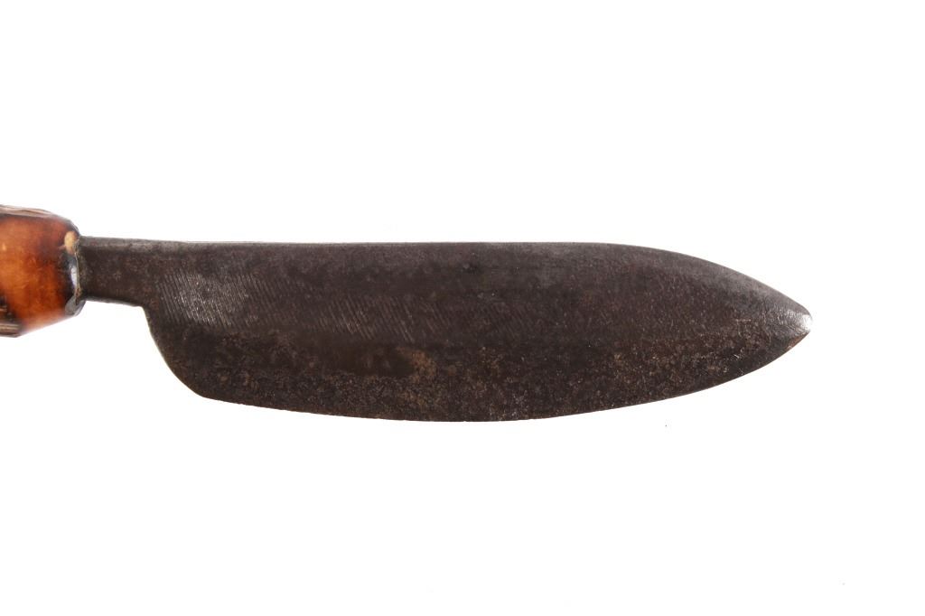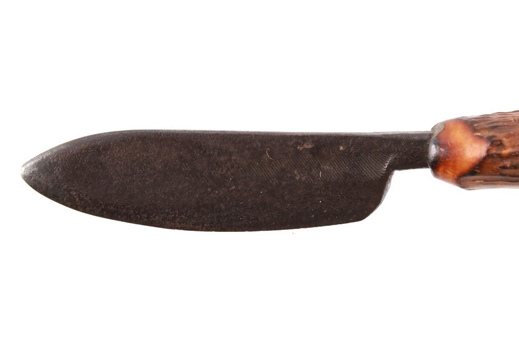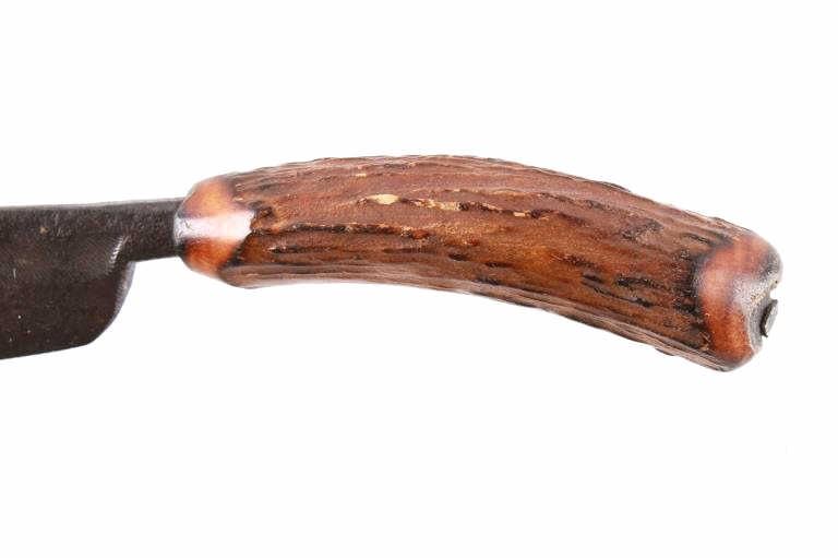 The lot features a parfleche beaded sheath with old rasp file stag handled knife, both attributed to the Sioux Native American Indians of the Plains. The knife shows a rasp file, which has been fashioned into a nice heavy knife and is set into the Stag antler with poured led pewter and is peened over at the end. The antler horn has a dark red to brown coloring with yellowing, an honest antique, 1800's patina. The sheath is parfleche rawhide with hide lacing sewing and an Indian tanned wrapping at the top, which is trade thread sewn on and has excellent geometric glass trade seed beadwork. The beadwork shows Cheyenne pink, light blue, semi-transparent pink, greasy blue, and cobalt. Below the beadwork is Indian hide tied with rolled tin jingle dangle cones. At the base are two Indian hide ties with rolled tin jingle dangle tones with red stroud wool fringes. The back of the sheath has the original Indian hide tie. Truly a fantastic pairing. The knife measures overall 8.75" L with the sheath being 15.5" L with fringe and tie strap.