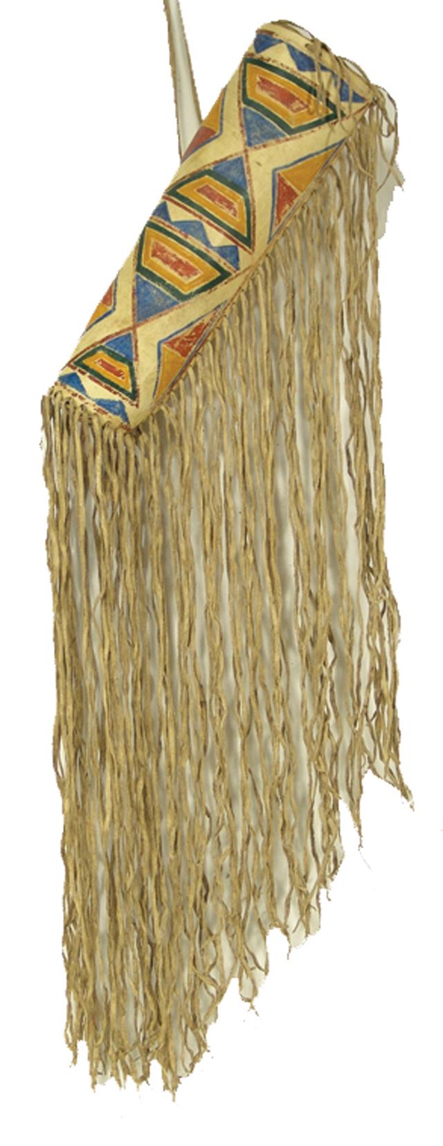 Mid 1900s, Fantastic and large cylindrical hard rawhide container with pigment painted geometric designs and long fringe. 21" x 6" plus 35" fringe