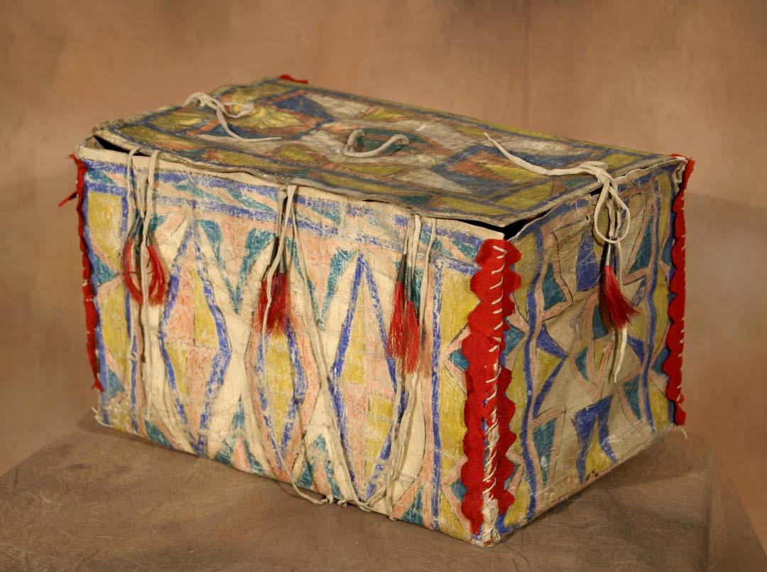 Sioux Parfleche Trunk. 10" x 10 ½" x 16". Painted geometric design with trade wool trim & horsehair tin cone tassels. 19th century. (est $4,000-6,000). For condition reports please visit: www.auctioninsantafe.com/cr2011.pdf
