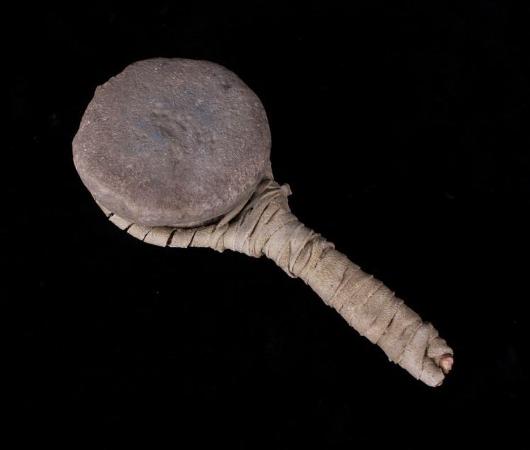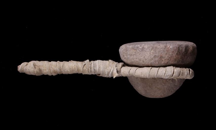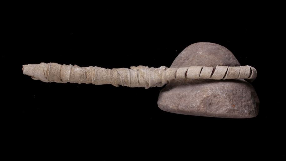 The lot features an original scarce Sioux Native American Indian stone artifact Pemmican Pounder Stone Hammer dating to the 19th Century. The piece has a pestle or maul design with willow branch wooden handle that is covered in Indian tanned hide wrapping. The stone has a deep ground groove which holds the willow branch handle. The stone shows a smooth flat to slightly curved surface. The piece is very similar to the example on display at the Museum of the Rockies in Bozeman, Montana circa 1870 and other rare examples. The piece is well preserved and in good overall condition. Pemmican was prepared from the lean meat of large game such as Buffalo / Bison, Elk, Deer or Moose. Measures overall 8.5"L x 3.5"W x 2.75"D.