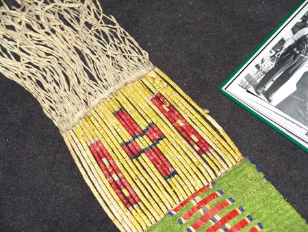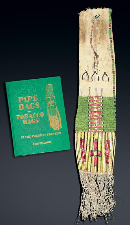 Circa Late 1800s, Beautiful sinew sewn and lazy stitch beaded antelope hide bag with long quilled suspensions, fine fringe, quilled red bars in the design and pipe and horse track designs. Very good condition. Pictured in John Baldwin's book "Pipe 32" x 6-3/8" From the Johnson Collection.