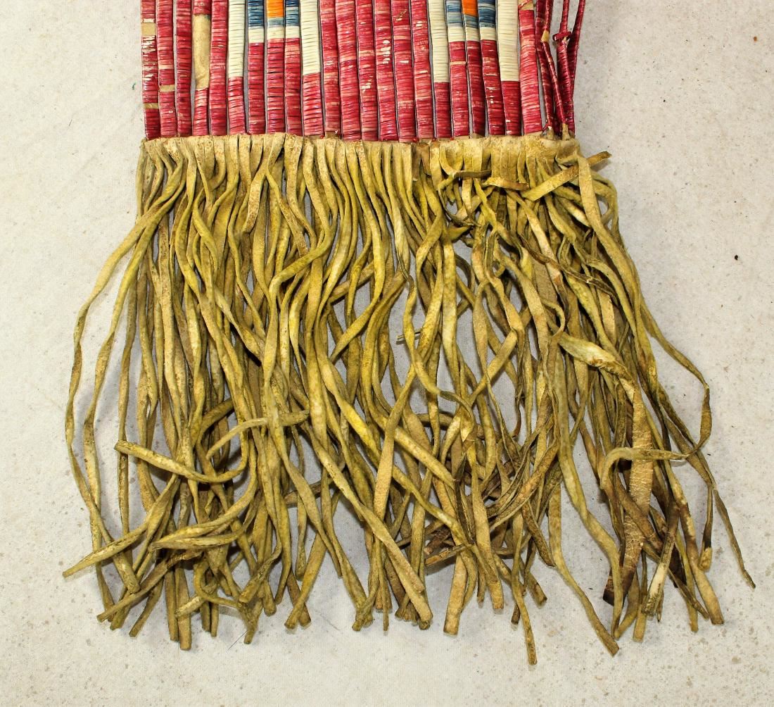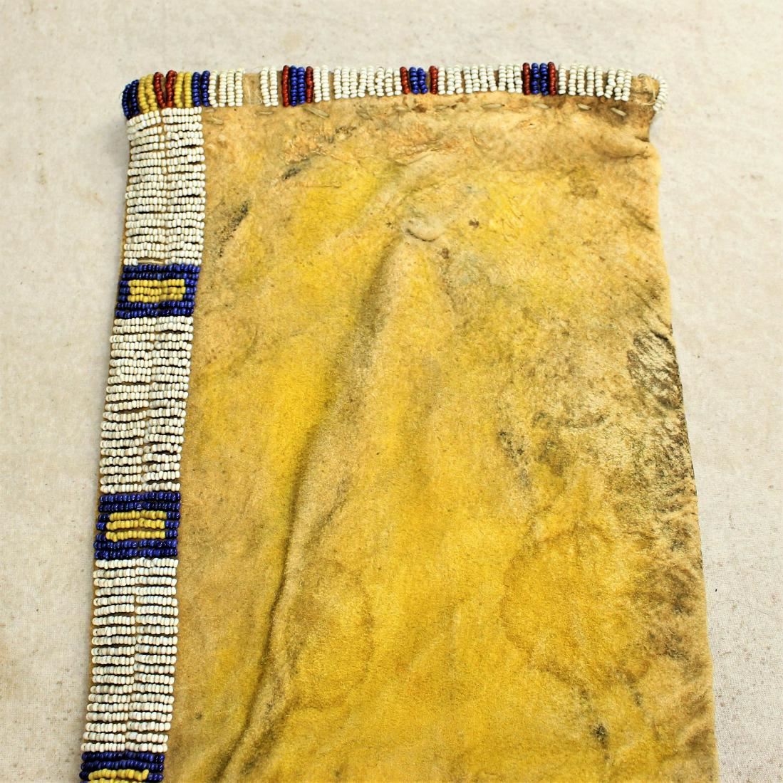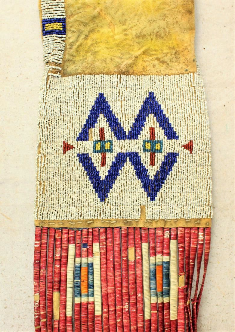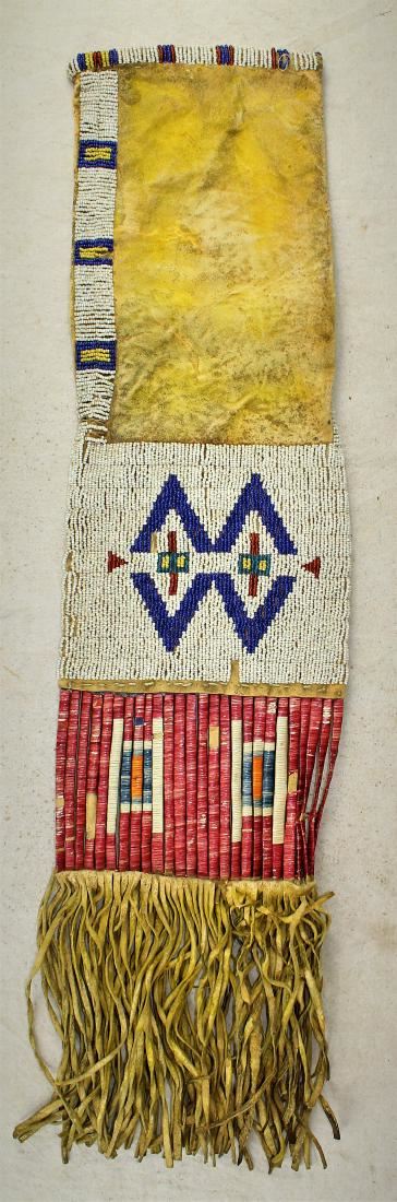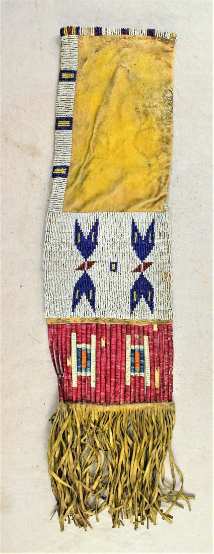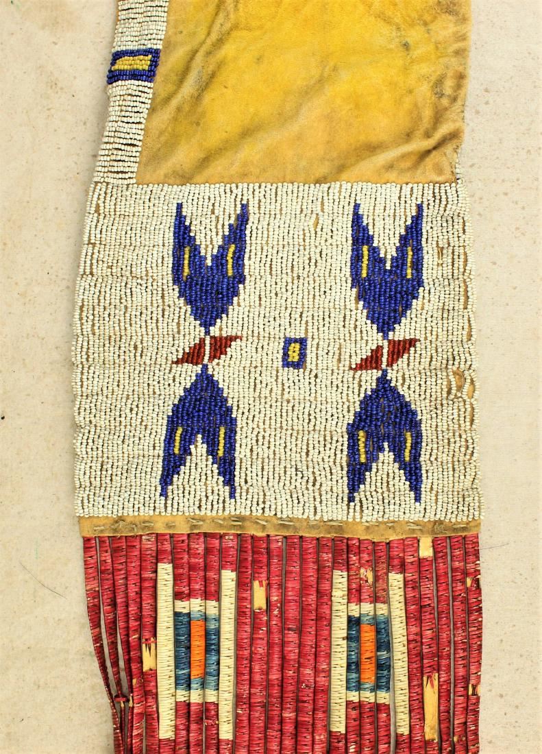 Large turn of the Century pipe bag with wonderful geometric bedwork on white background, with detailed colorful quilled fringe. Measurements 7"x 28".