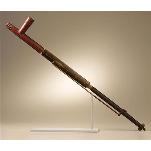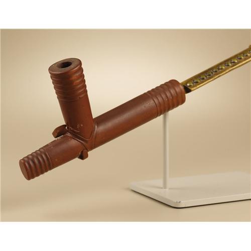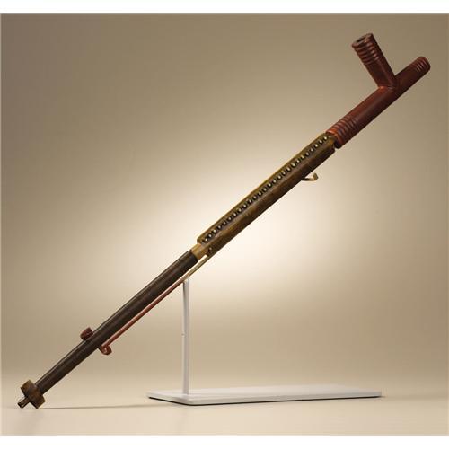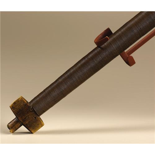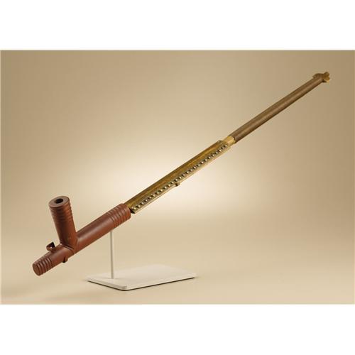 <B>Sioux Pipe Bowl and Stem Wrapped with Copper Telegraph Wire</B></I><BR>Circa 1880<BR>Length 28 1/2 in. overall<BR><BR>The ash wood stem is wrapped with copper wire along half its length. A row of brass upholstery tacks decorates the flat section. The stem is accompanied by a catlinite "T" shaped bowl artfully carved with circular decorative bands.<BR>Brass wire was a coveted item and Indian traders made an effort to have quantities available. Brass wire was even included in annuity payments to the tribes. It was used to make earrings, bracelets, and armbands for both men and women. Tomahawk handles and pipestems were occasionally wrapped with brass wire for decorative effect.<BR>Copper, however, was used for telegraph wire and it is interesting to speculate on the source of wire for this pipestem.<BR><BR>Provenance<BR>James Hart. Acquisition, Inc., Maple Shade, New Jersey.<BR><BR>Reference<BR>Hanson, James. <I>Metal Weapons, Tools, and Ornaments of the Teton Dakota Indians.</B></I> University of Nebraska Press, Lincoln, 1975, pp. 98-100.<BR><BR> <BR><BR><B>Important not