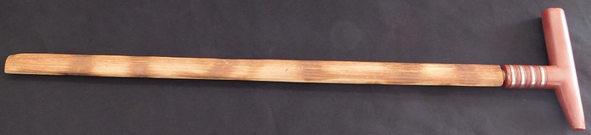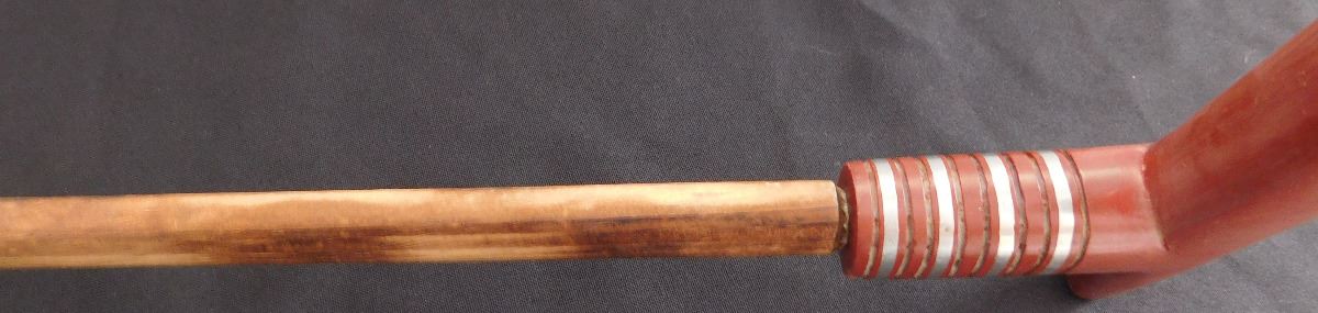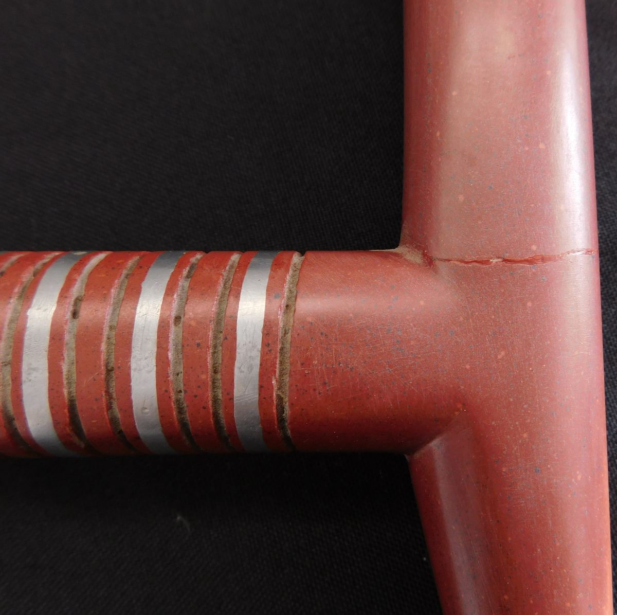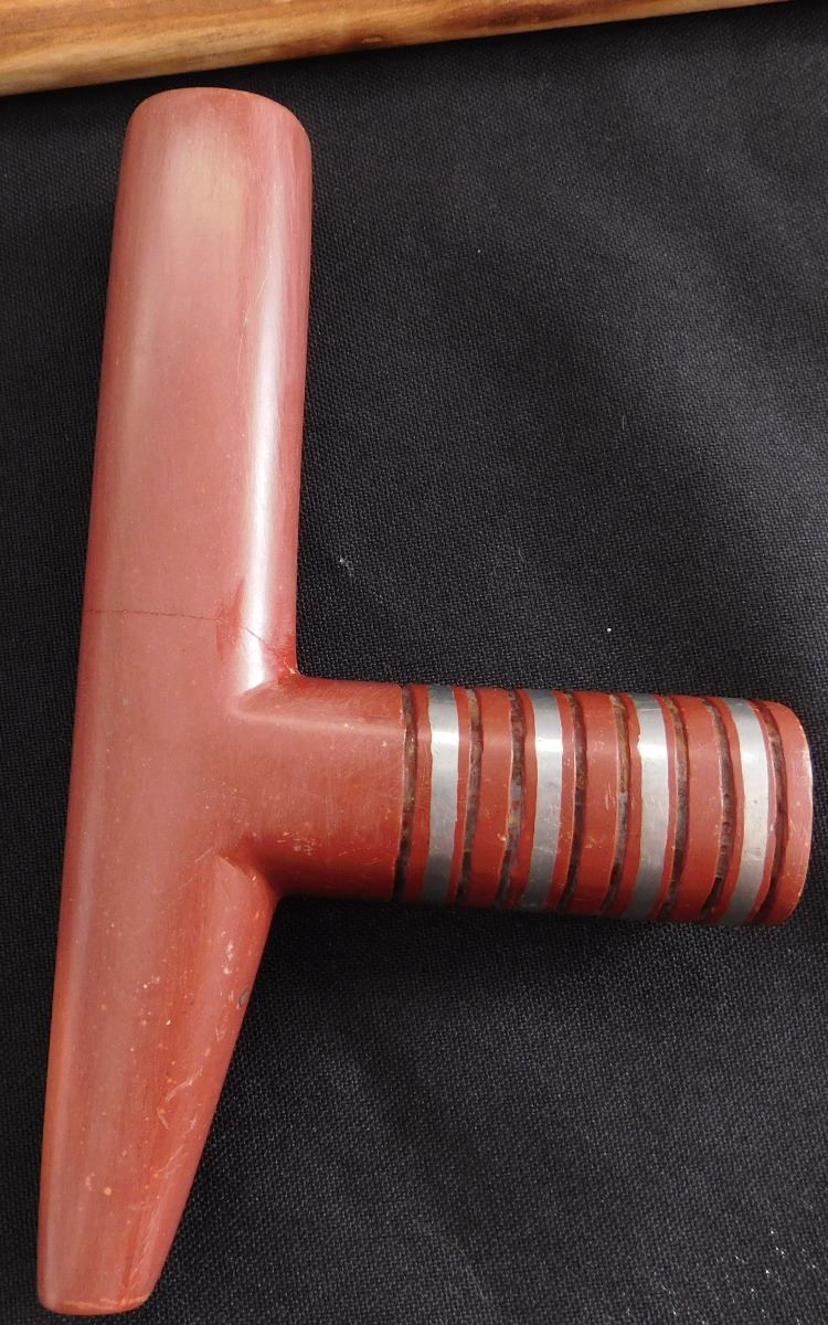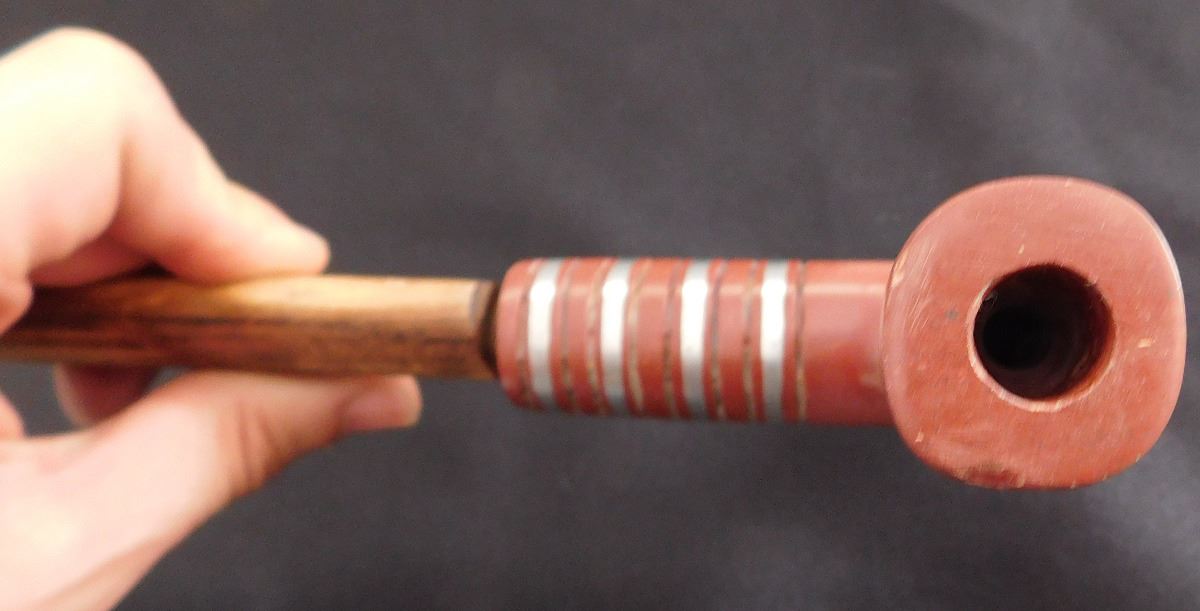 Sioux Pipe & Stem, 20th century. Made of catlinite and wood with pewter inlay. Item measures 27" x 6" x 1". Sioux, from the Dakotas. Nice pewter inlay in bowl. Condition: Minor restoration to crack in bowl, see images. Shipping: $24.50