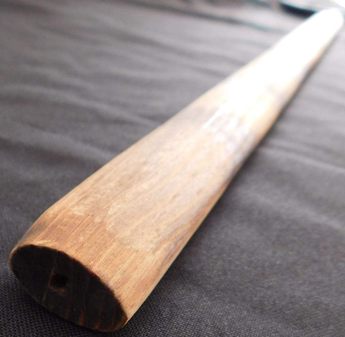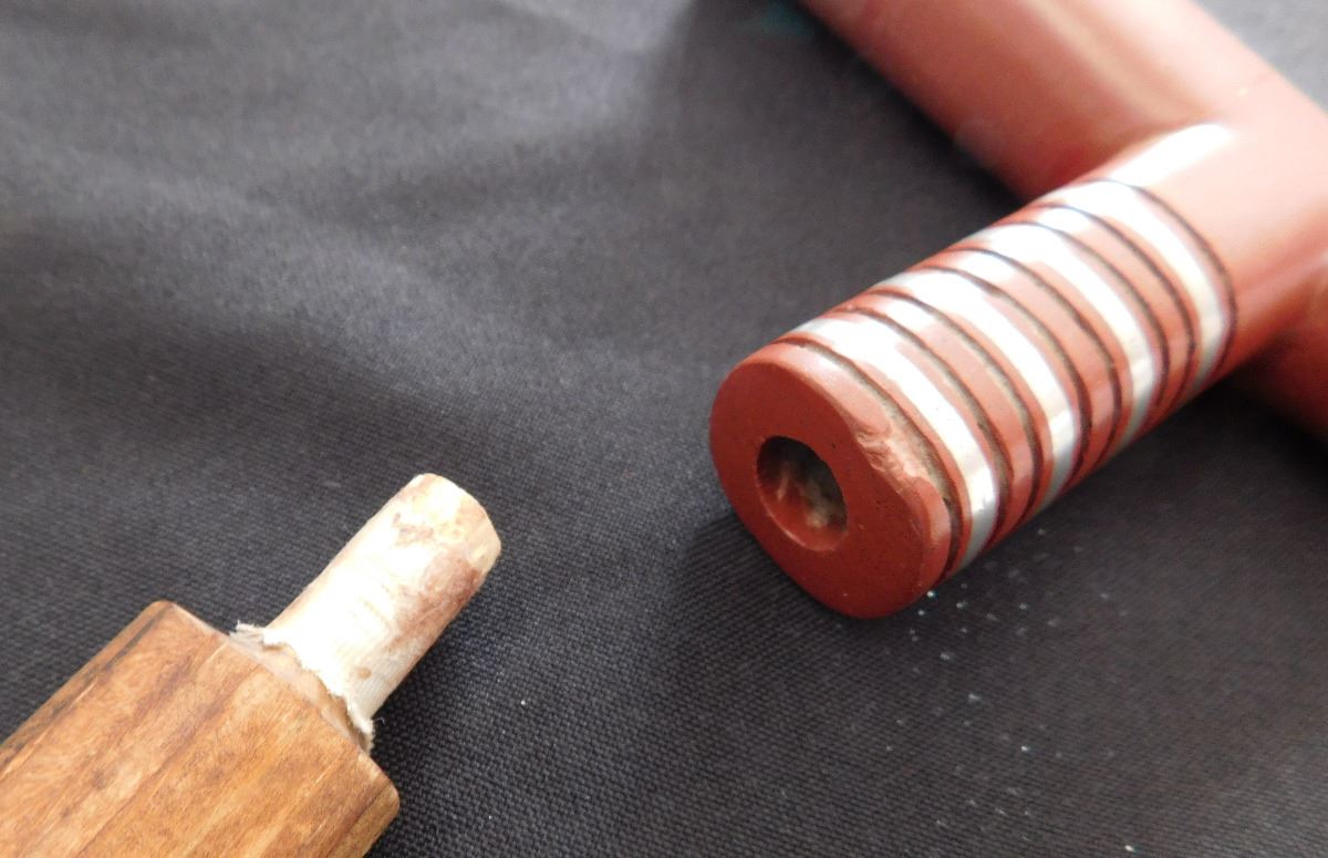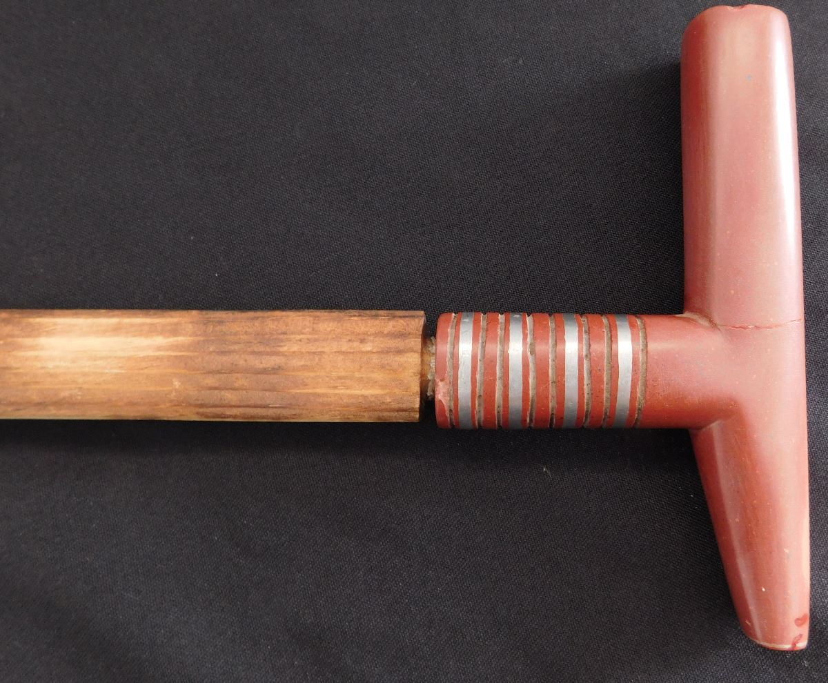 Sioux Pipe & Stem, 20th century. Made of catlinite and wood with pewter inlay. Item measures 27" x 6" x 1". Sioux, from the Dakotas. Nice pewter inlay in bowl. Condition: Minor restoration to crack in bowl, see images. Shipping: $24.50