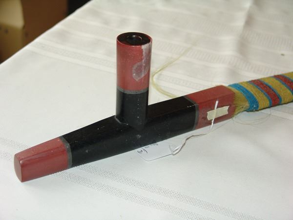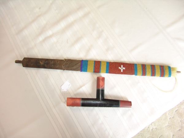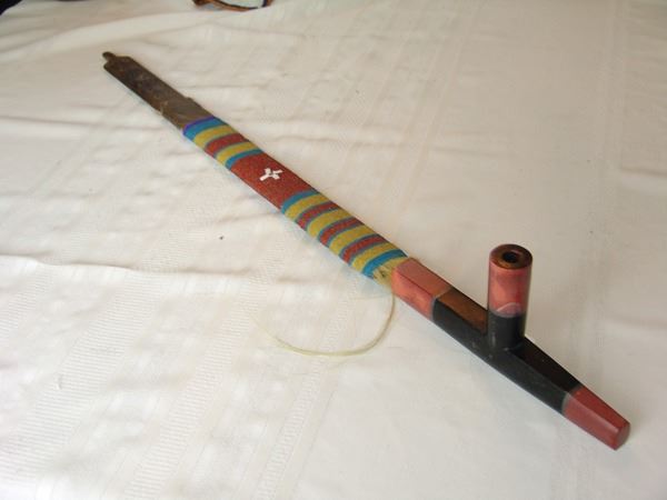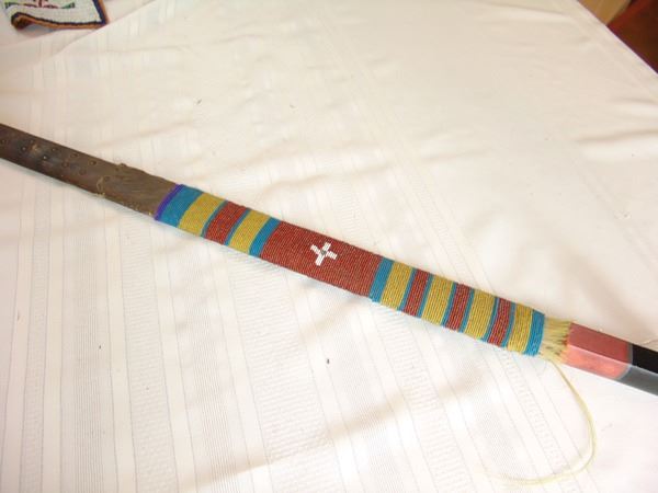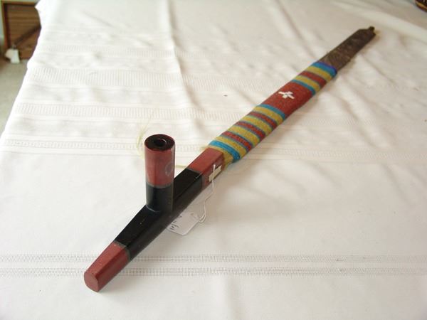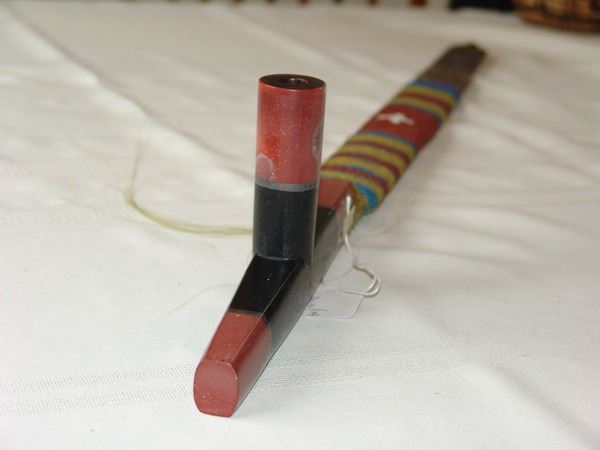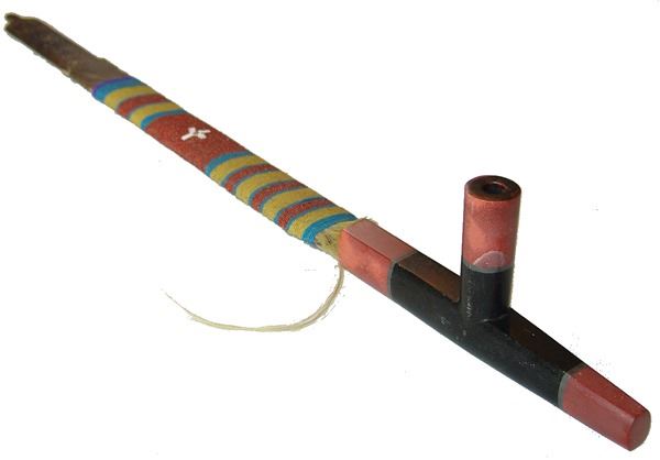 Classic, hand carved T-bowl pipe head done in red and black pipestone with pewter inlays, on an earlier, hand carved wooden stem that has brass tacks and colorful beadwork that is from the mid 1900s. Very good condition. Ex. Mark Wald Collection.