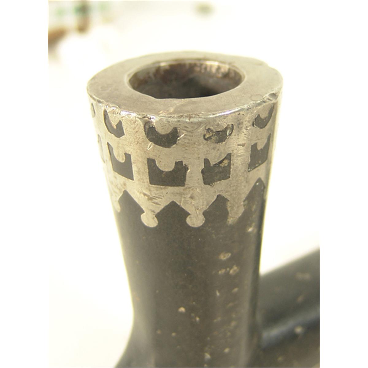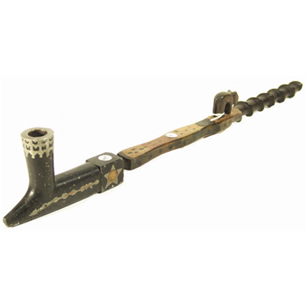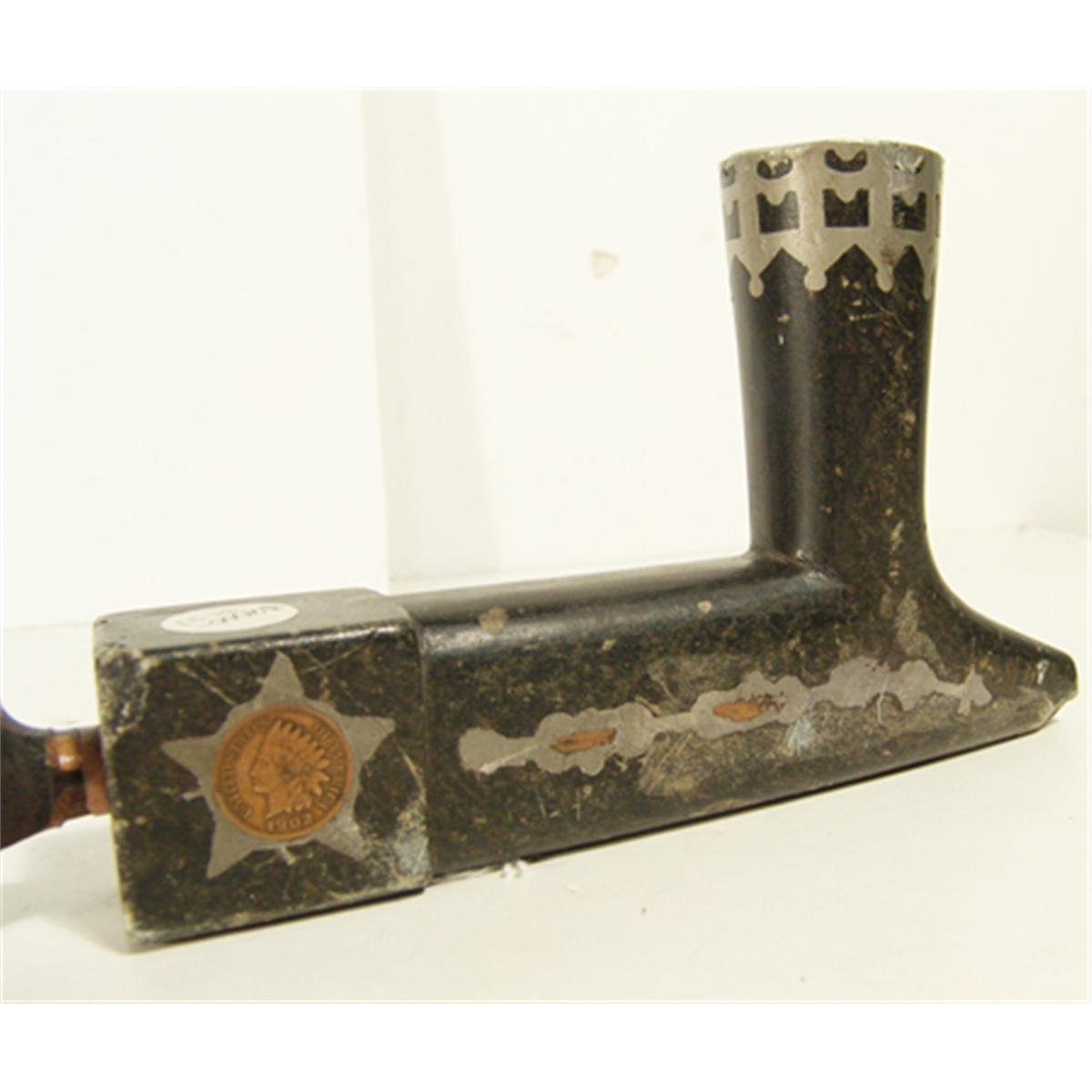 A beautiful early 1900s carved black stone pipe with fine pewter inlays including 1906 Indian head cents within stars, plus a fancy early to mid 1900s carved wooden twist stem. Condition: very good. Stem 24" x 2-1/2", pipe 7" x 3-1/2"