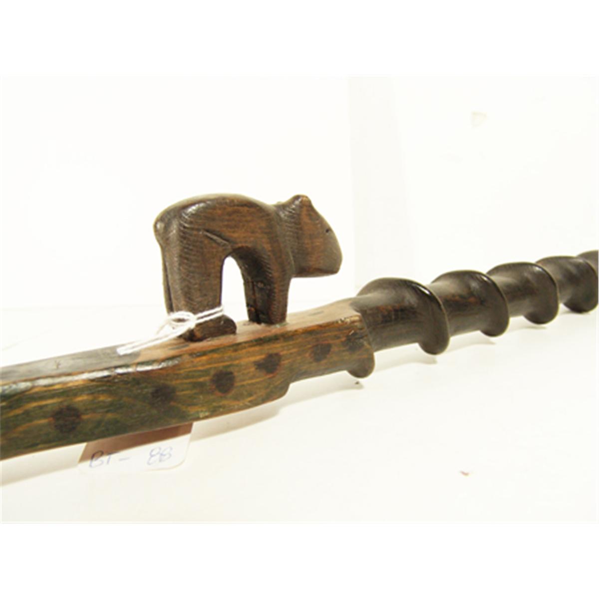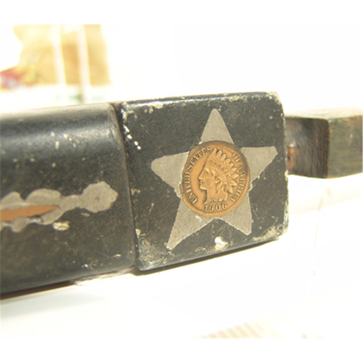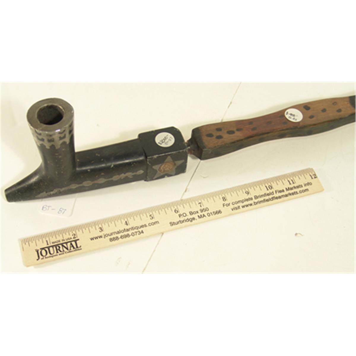 A beautiful early 1900s carved black stone pipe with fine pewter inlays including 1906 Indian head cents within stars, plus a fancy early to mid 1900s carved wooden twist stem. Condition: very good. Stem 24" x 2-1/2", pipe 7" x 3-1/2"