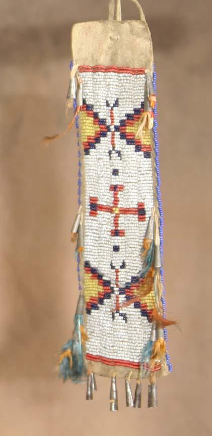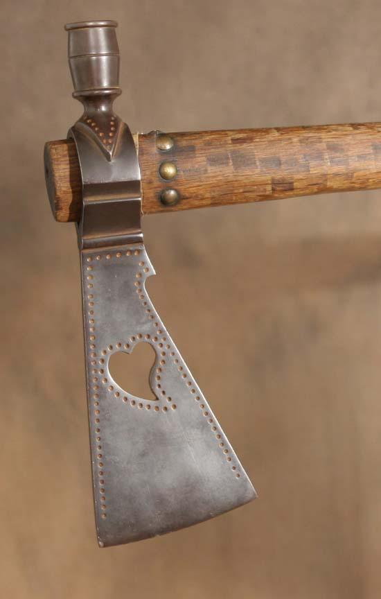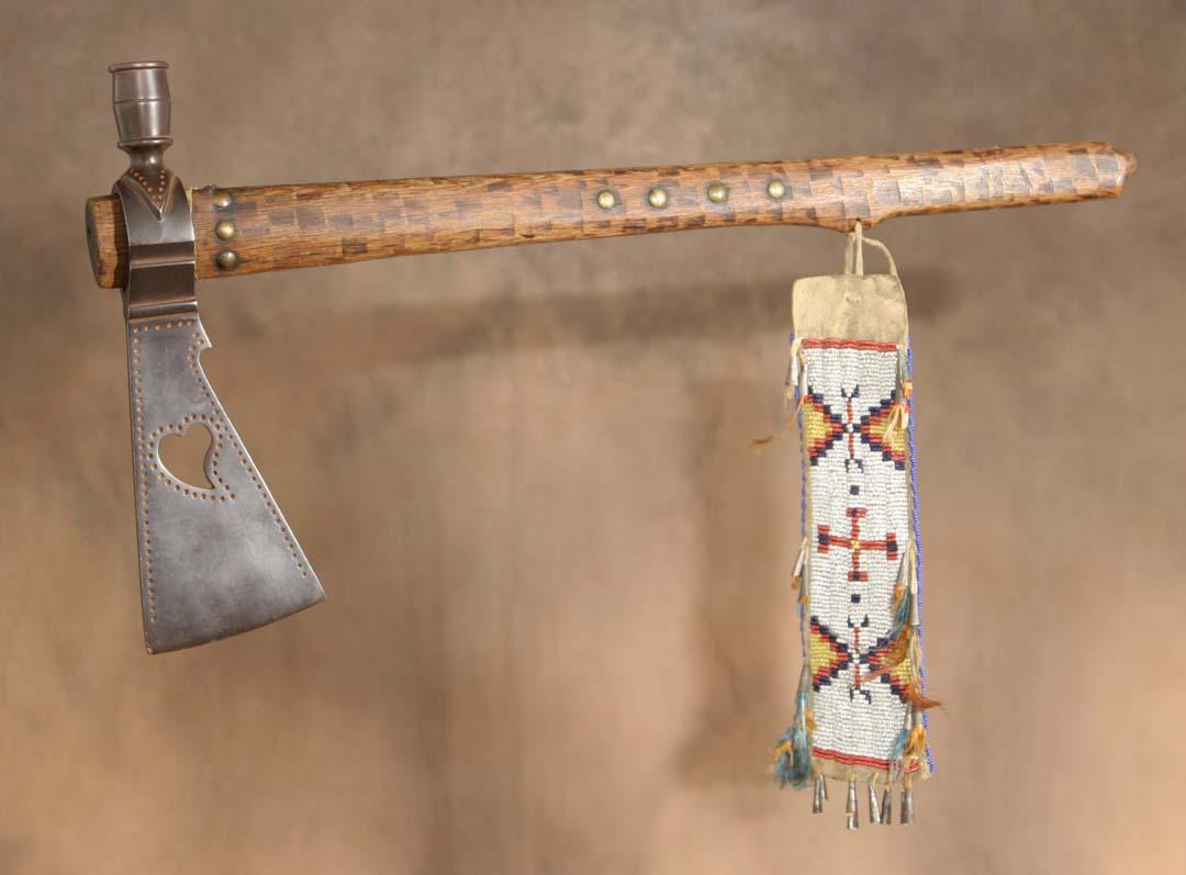 Sioux Pipe Tomahawk. 10" x 3 ½" iron head with heart cutout. 20 ½" file burned & tacked stem. 10" x 2½" beaded drop. Presentation grade. Circa 1890. (est $3,000-4,500). Provenance: Parson's Indian Museum, Wisconsin Dells, WI. . For condition reports please visit: www.auctioninsantafe.com/cr2011.pdf