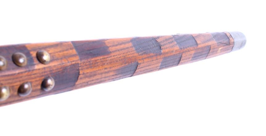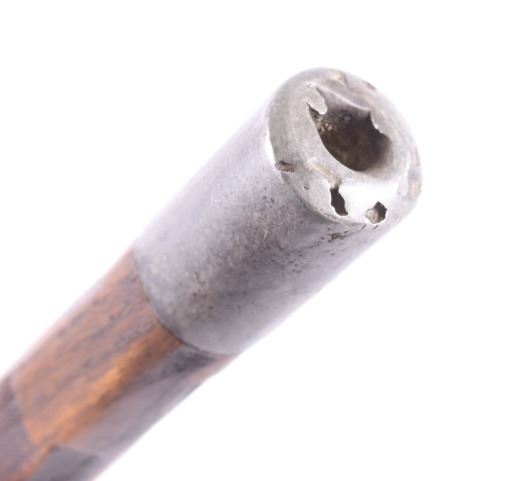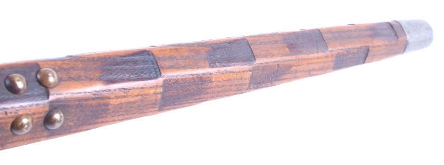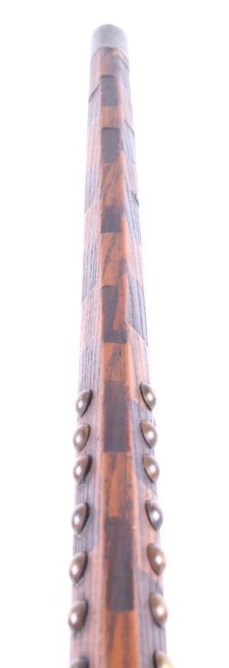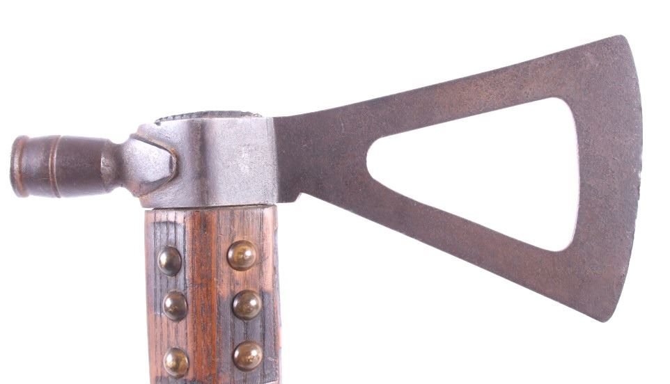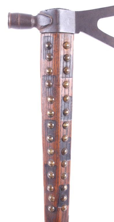 The lot features a unique cutout blade pipe tomahawk with a forged construction from the Sioux Native American Indians. The tomahawk is said to date to circa 1890-1900’s. The blade shows signs of being blacksmith forged with various fold remnants and tool marks. The pipe bowl and hip were cast and added by the blacksmith. The tomahawk shows a solid wood haft handle with silver pewter poured smoking tip, file branded accents and later added brass covered iron tacks. This post-Indian Wars reservation period tomahawk comes with an index card showing origin and age. Provenance: From a large early American Antiquities collection in Perham, Minnesota (the same collection as the Algonquin Indian Canoe that sold in our 10/27/2018 sale for $6,000). The brass tacks were thought to have been a later addition to the club as they are a round iron shank brass covered tack from circa 1950-1960’s. Measures overall 24” long by 9” wide.