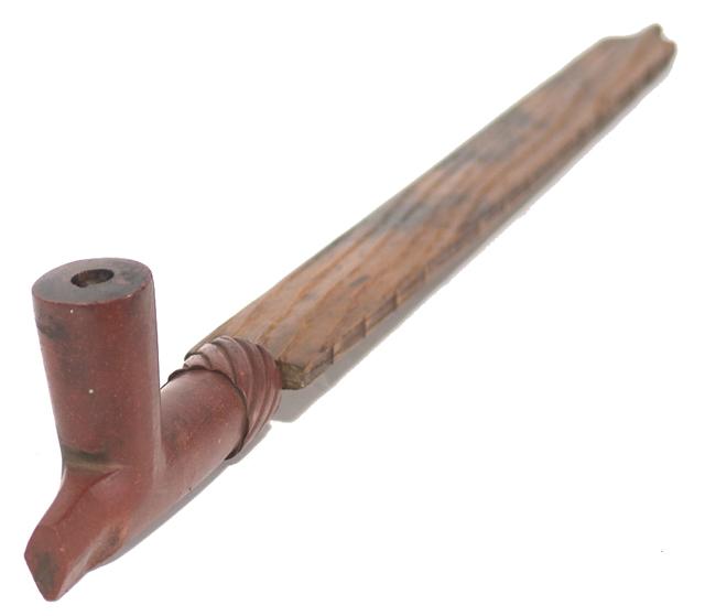 Circa 1890, Genuine old hand carved catlinite pipe with original old file branded ash stem - Pine Ridge, South Dakota. 21"