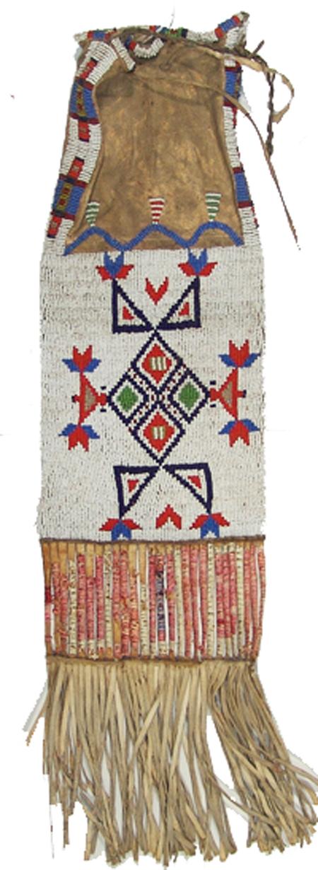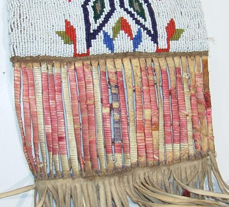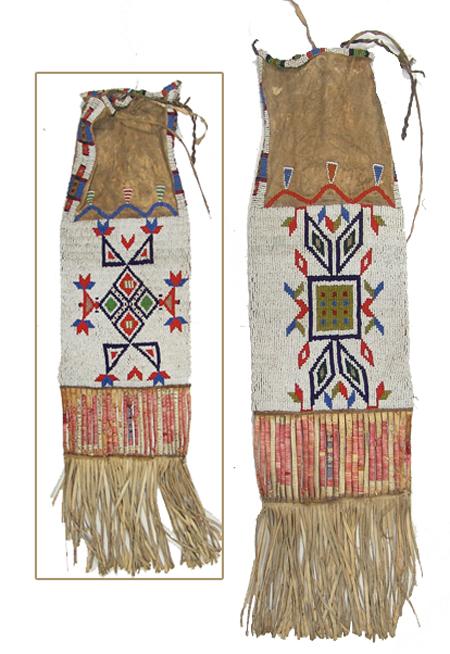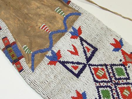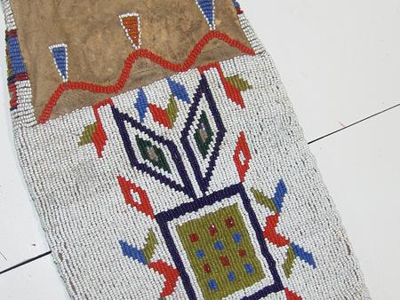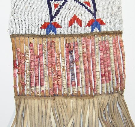 Classic design sinew sewn and lazy stitch beaded bag with quilled slat suspensions, two-sided geometric design, buckskin fringe, and beaded edging/accents. Condition: very good, usual wear, some missing quills. 24" x 7"