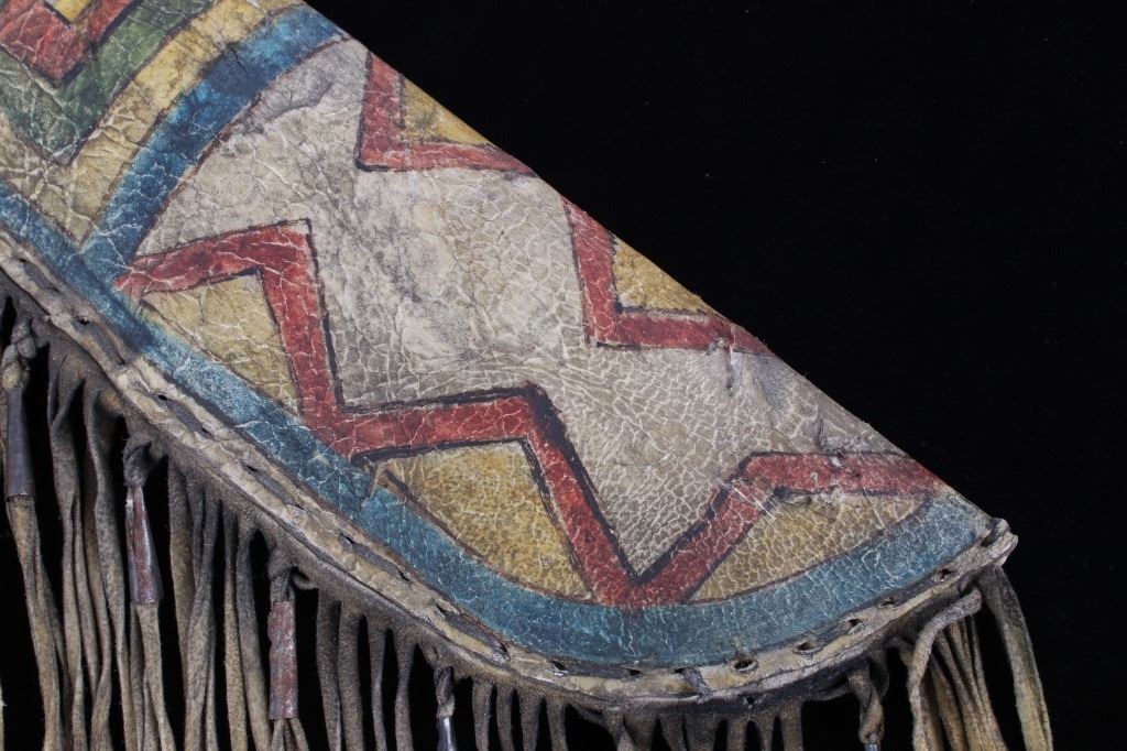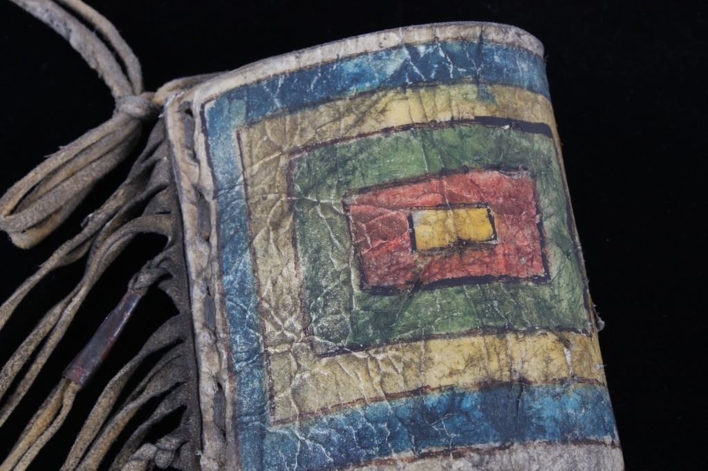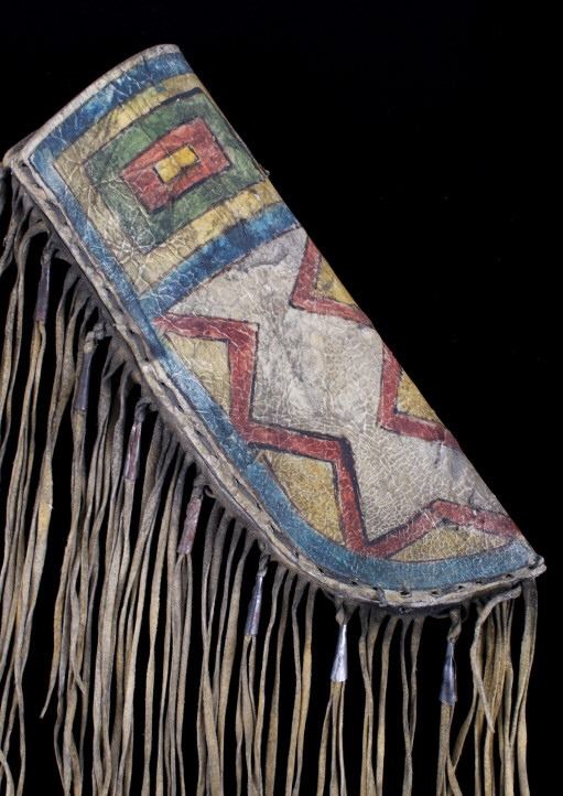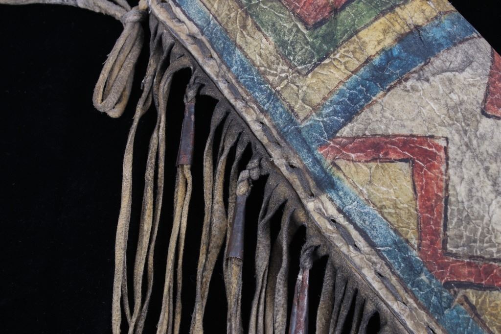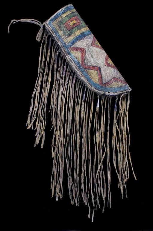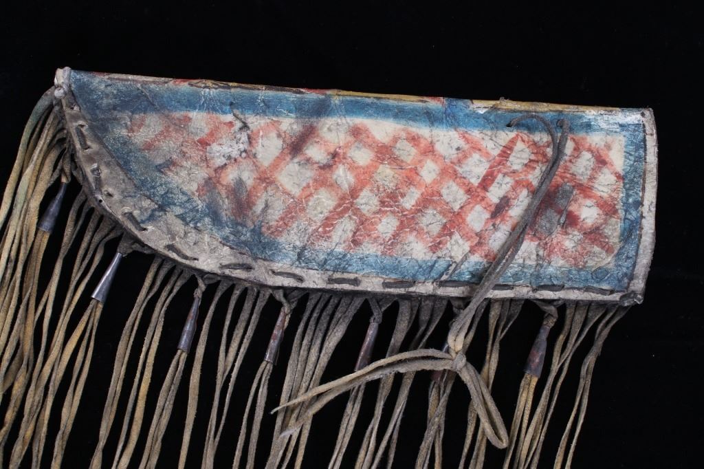 The lot features a wonderful Sioux Native American Indian polychrome painted parfleche rawhide sheath. The sheath shows a parfleche rawhide construction with multi-colored or polychrome geometric design painted in blue, green, yellow, green, and red. The sheath is accented by long hand cut Indian tanned hide fringe that shows some rolled tin jingle cones. Overall the sheath measures 10.25"L x 3.5"W with an additional 10" to 13" long hand cut fringe.