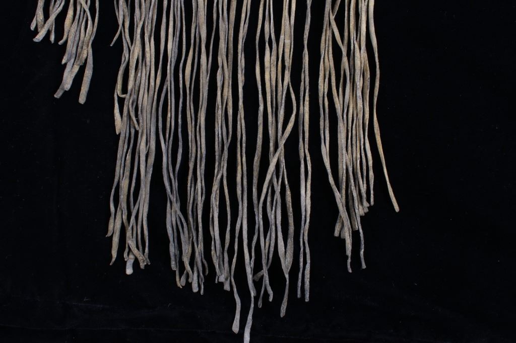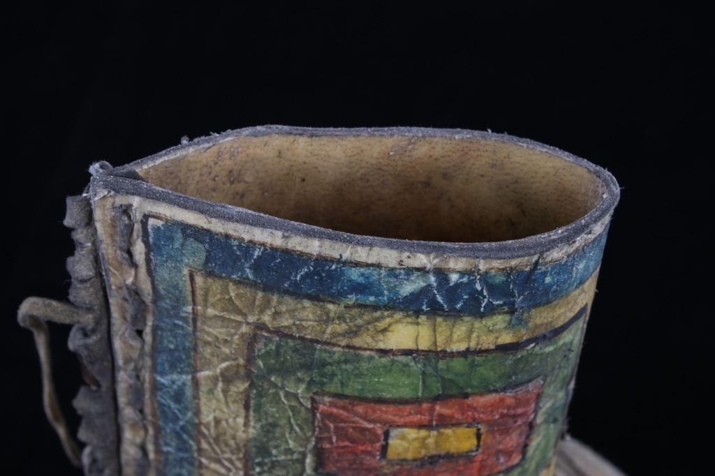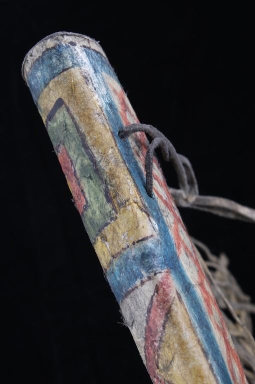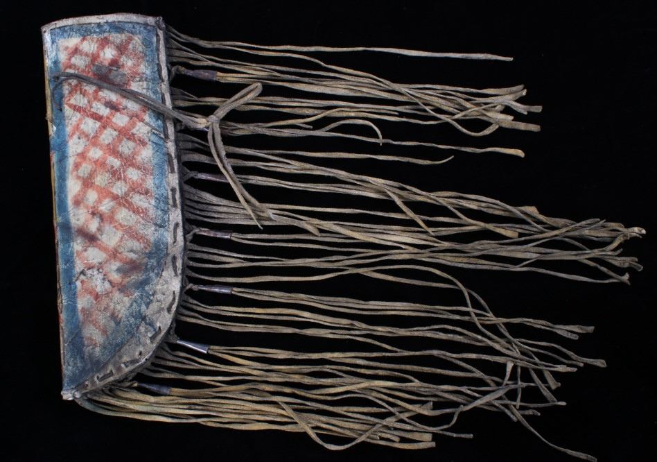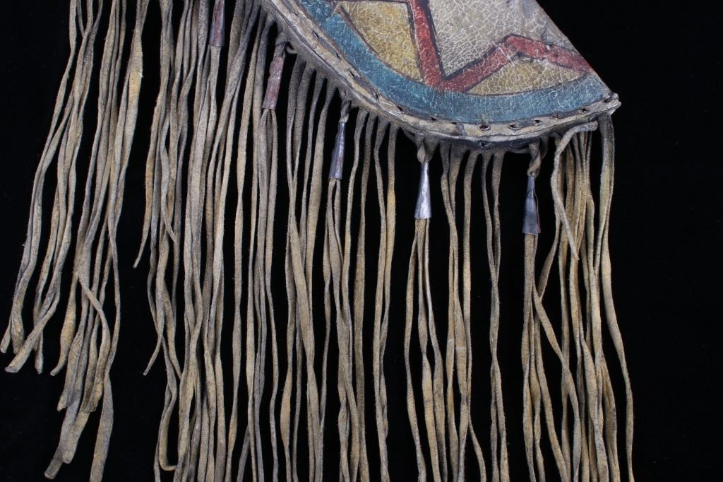 The lot features a wonderful Sioux Native American Indian polychrome painted parfleche rawhide sheath. The sheath shows a parfleche rawhide construction with multi-colored or polychrome geometric design painted in blue, green, yellow, green, and red. The sheath is accented by long hand cut Indian tanned hide fringe that shows some rolled tin jingle cones. Overall the sheath measures 10.25"L x 3.5"W with an additional 10" to 13" long hand cut fringe.
