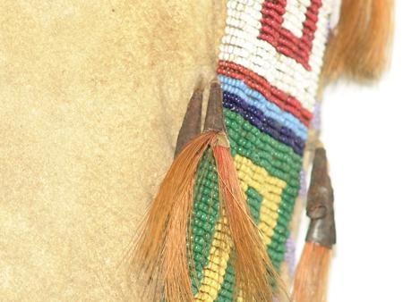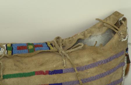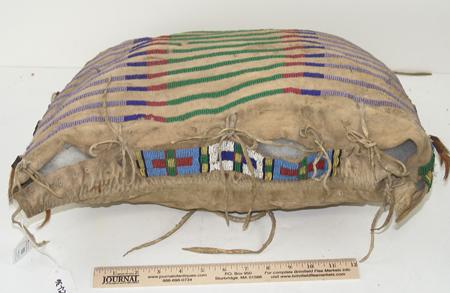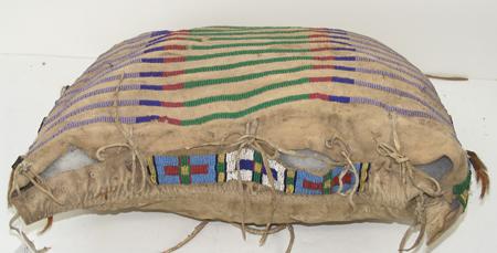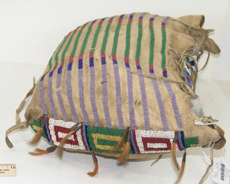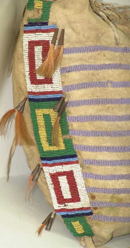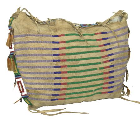 Circa Early 1900s, Fantastic buffalo hide possible bag with sinew sewn and lazy stitch beaded designs on sides, top, and front. Very good condition, some minor restoration. Pristine example. 15" x 20-1/2"