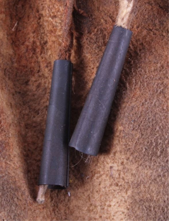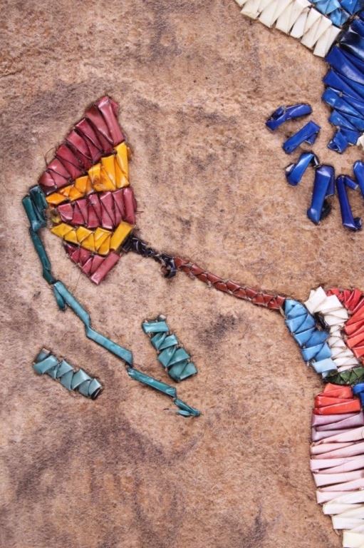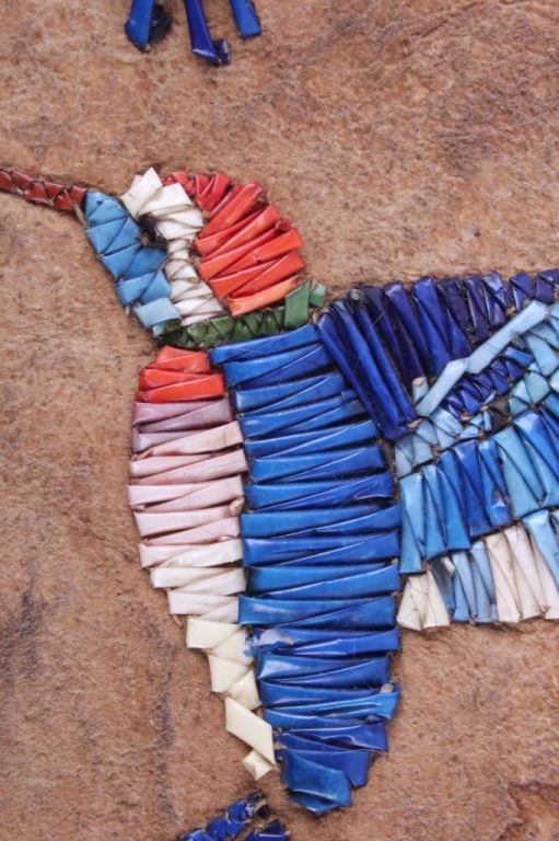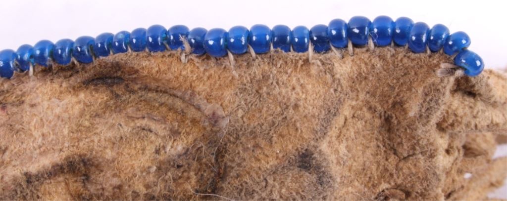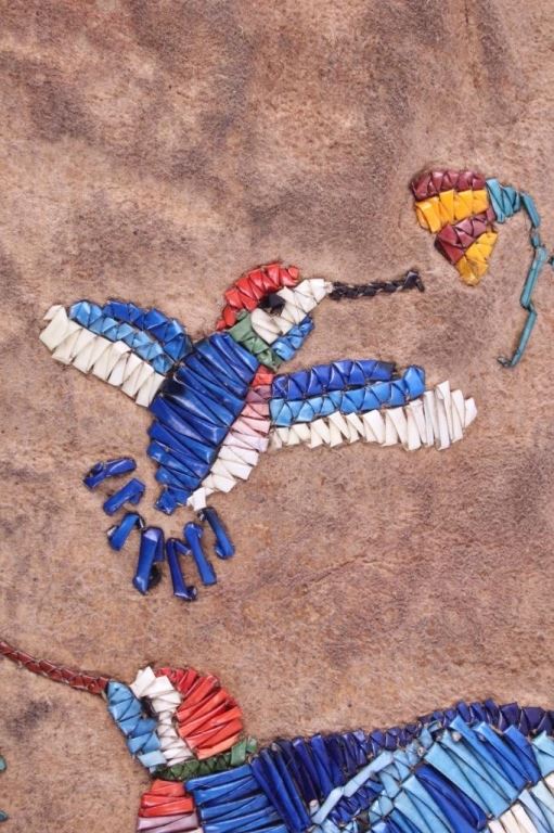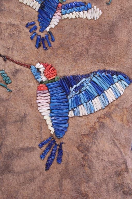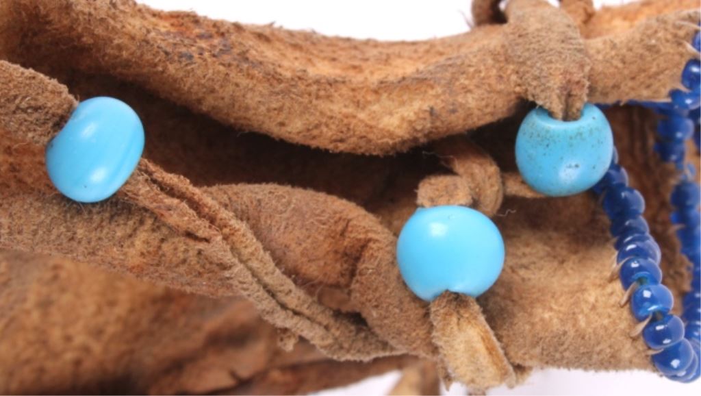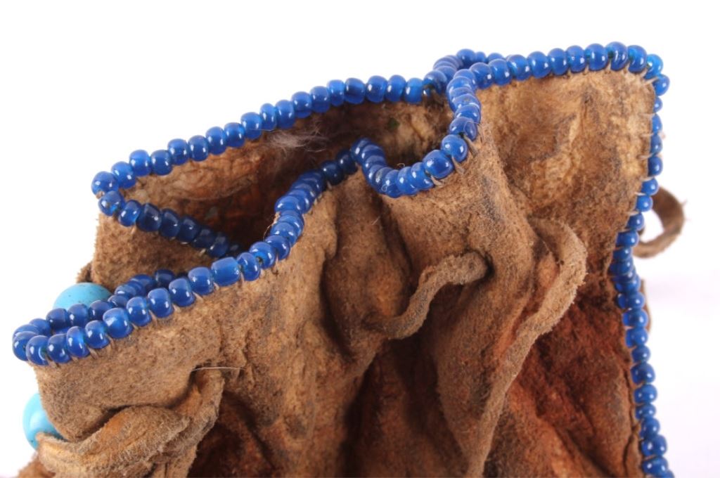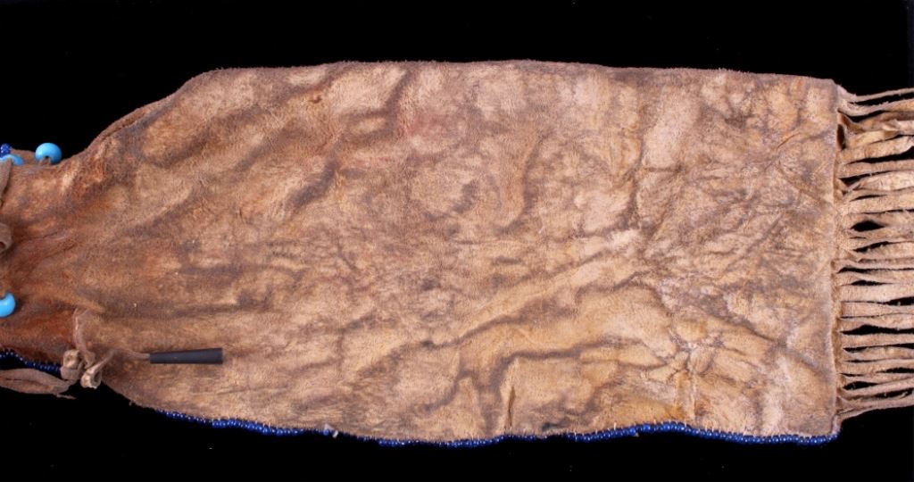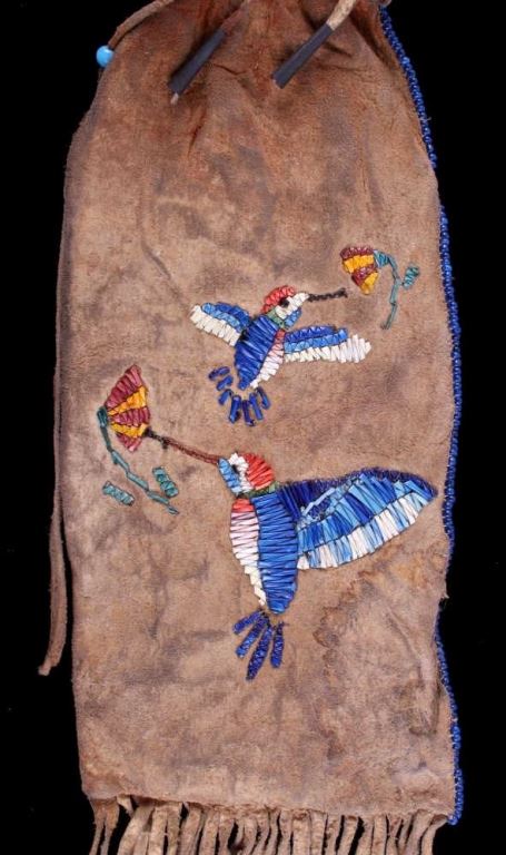 This is a Sioux Native American Indian quill worked pipe bag showing a beautiful Hummingbird pictorial design. The bag has excellent quill work and a fancy beaded cobalt blue early glass pony trade beaded edge. This also has long cut fringe and early trade sky padre blue beads. Indian tanned hide. The piece is an early 1900's piece. Tin Cones. Measures 19"x5.5".