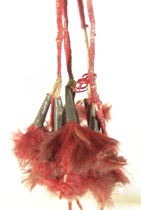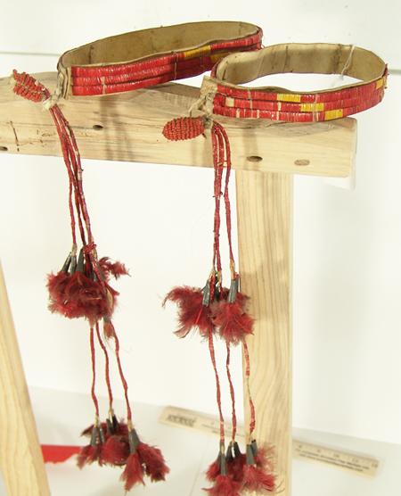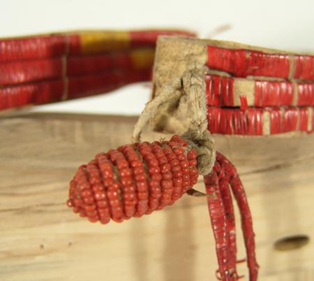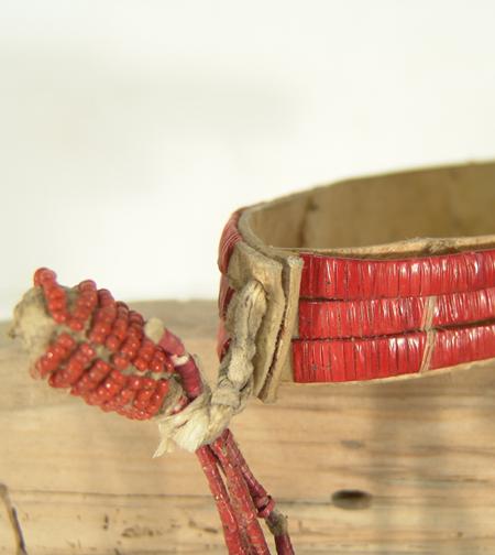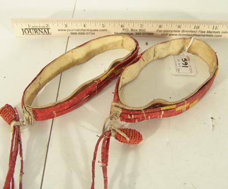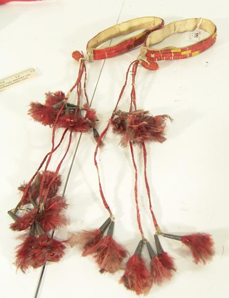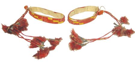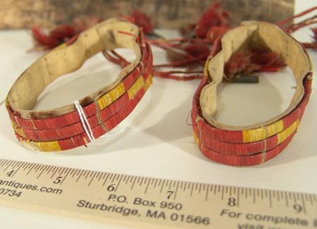 Rare pair of bright red quilled armbands with matching quilled suspensions with tin cones, feathers, and horsehair. Ex: Borglum collection. Purchased from Arrowsmith in 1979 for $295. Condition: very good. 1" wide