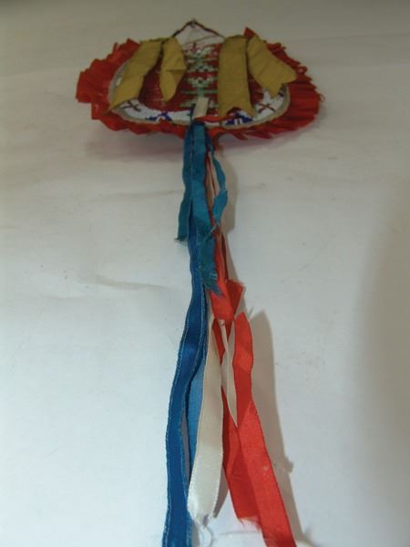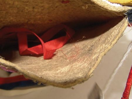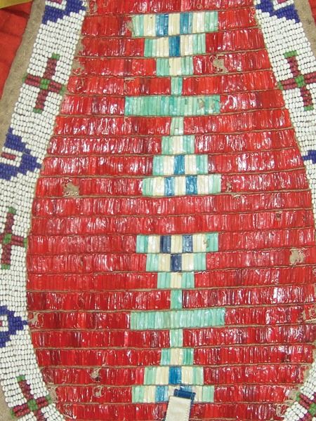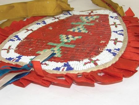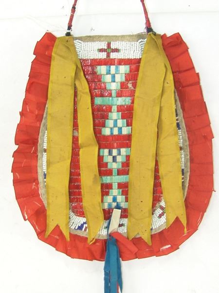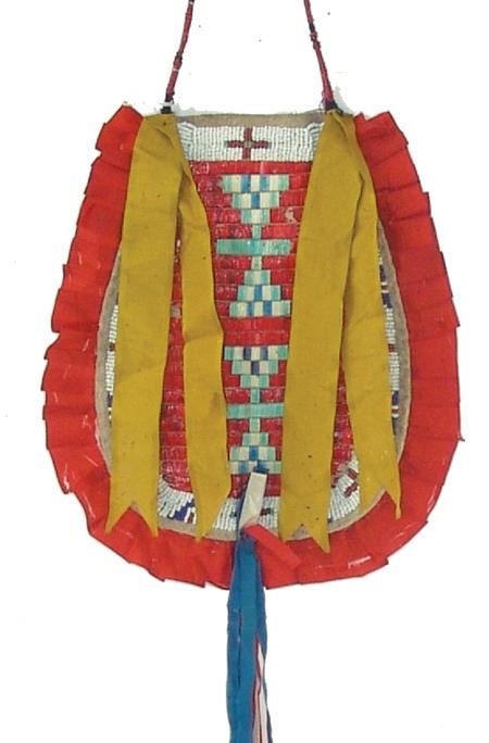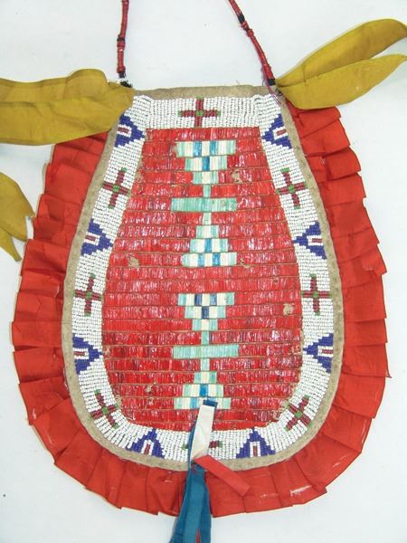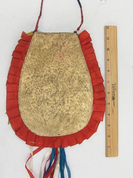 Early/Mid 1900s, Colorful ribbon trimmed U-shaped buckskin shield bag with flat quilled central section surrounded by sinew sewn and lazy stitch beaded trim. Very good condition, minor quill loss, minor edge erosion. 9-1/4" x 6-3/4" + ribbon