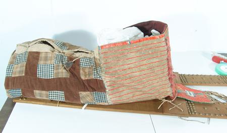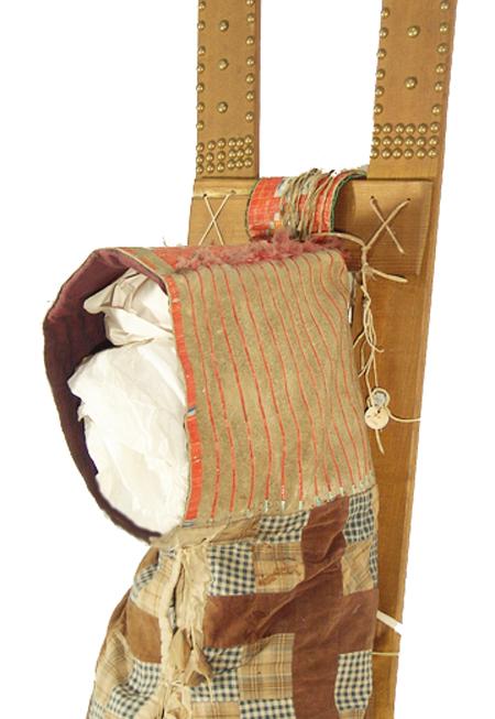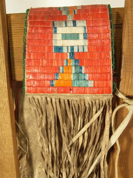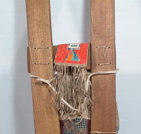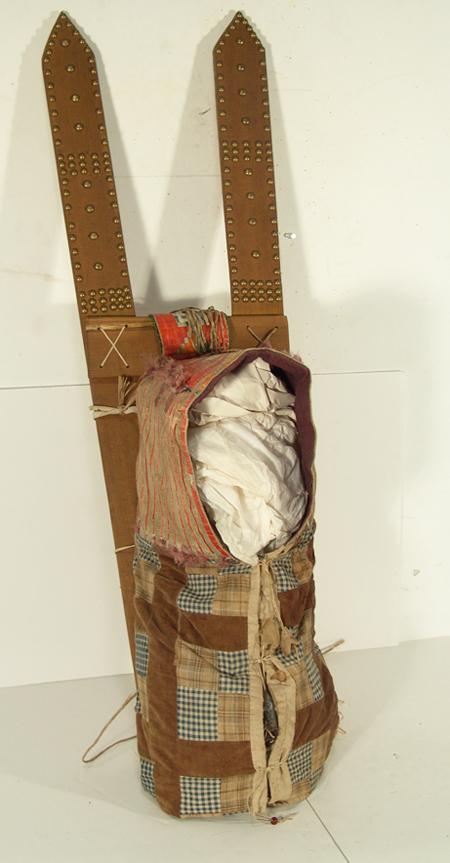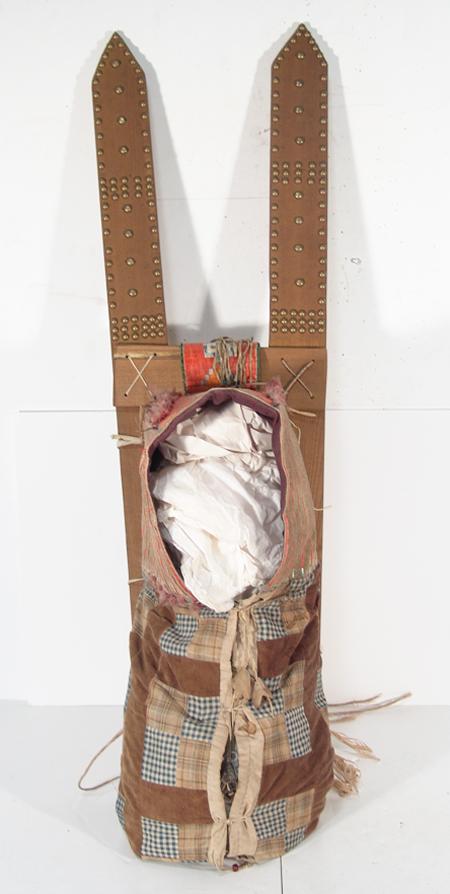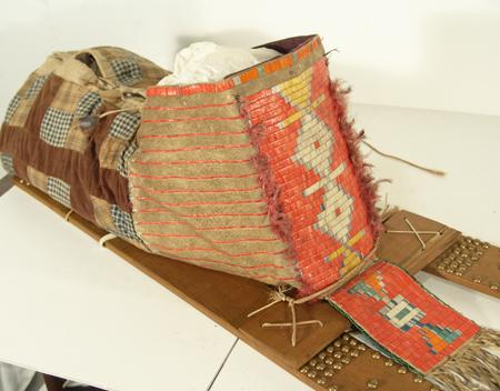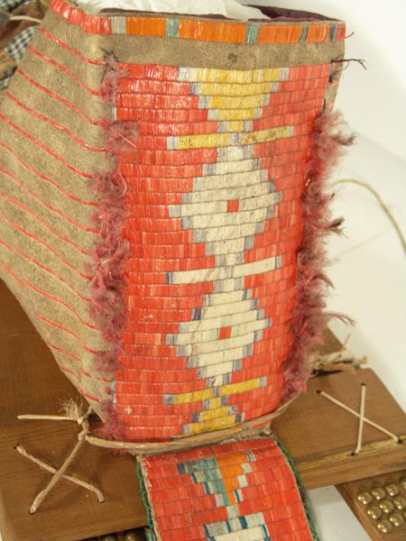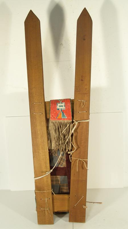 Fantastic old quilled cradleboard (on newer slats) with solid top, two-sided tab, and red rows on the sides. Bottom is an old patch quilt. Purchased from Fenn in 1978 for $1,500; appraisal value $3,500. Condition: very good, museum piece. Full size