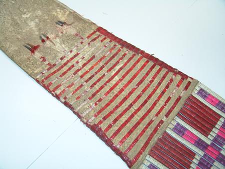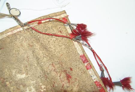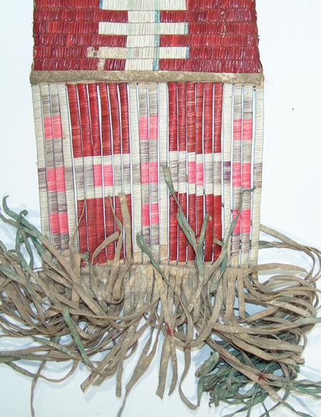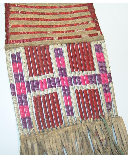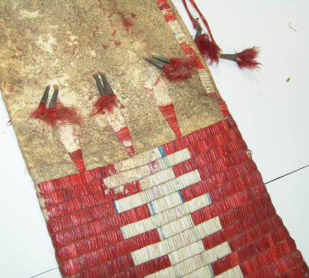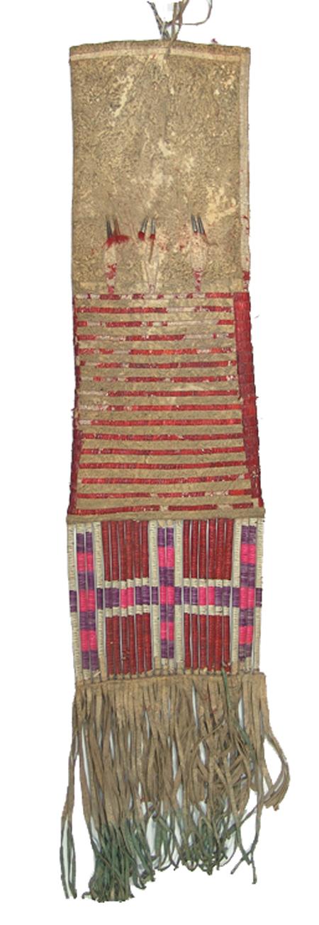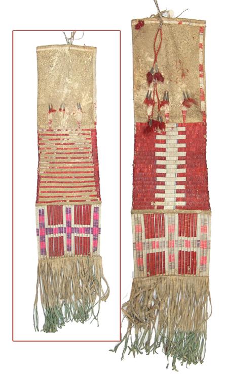 Fantastic long buckskin bag completely decorated with quillwork including the face, back, slat suspensions, and buckskin thong. Condition: very good, a few missing quills. 33" x 7-1/4"