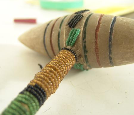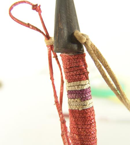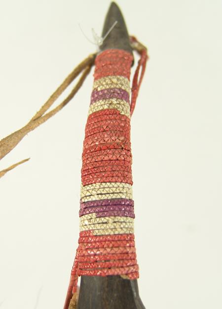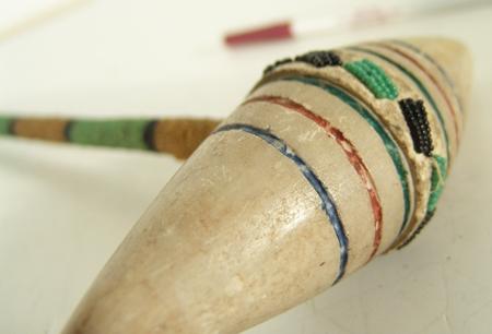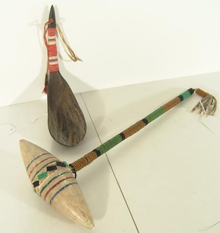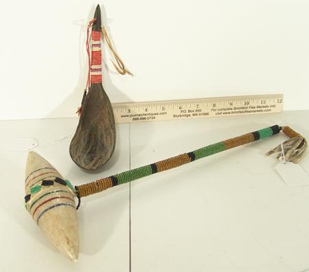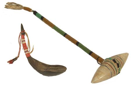 A beautiful early to mid 1900s quilled horn spoon plus an early to mid 1900s double point beaded long handled club. Both in excellent condition. Purchased in 1970 for $250; appraisal value $1500. 8-3/4" and 14"