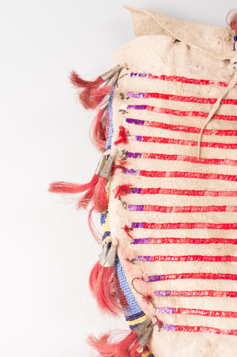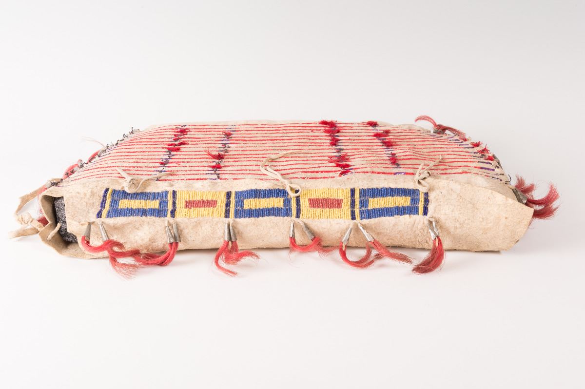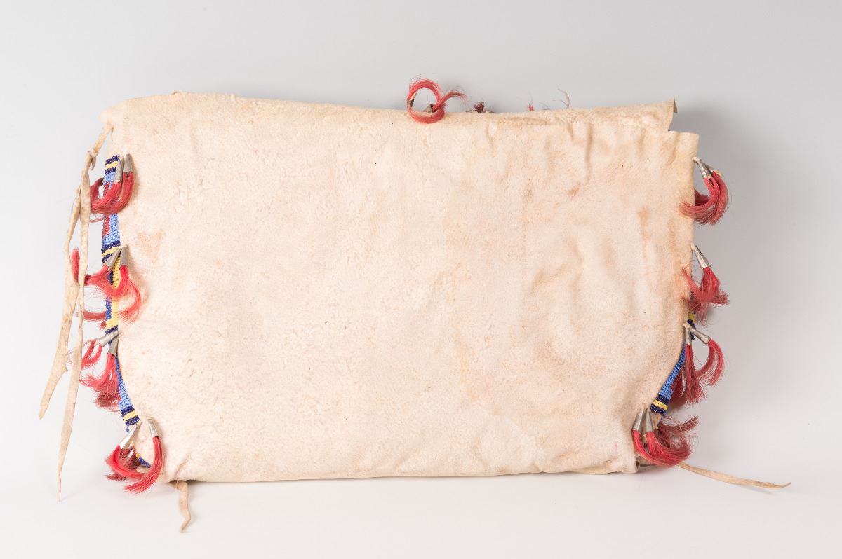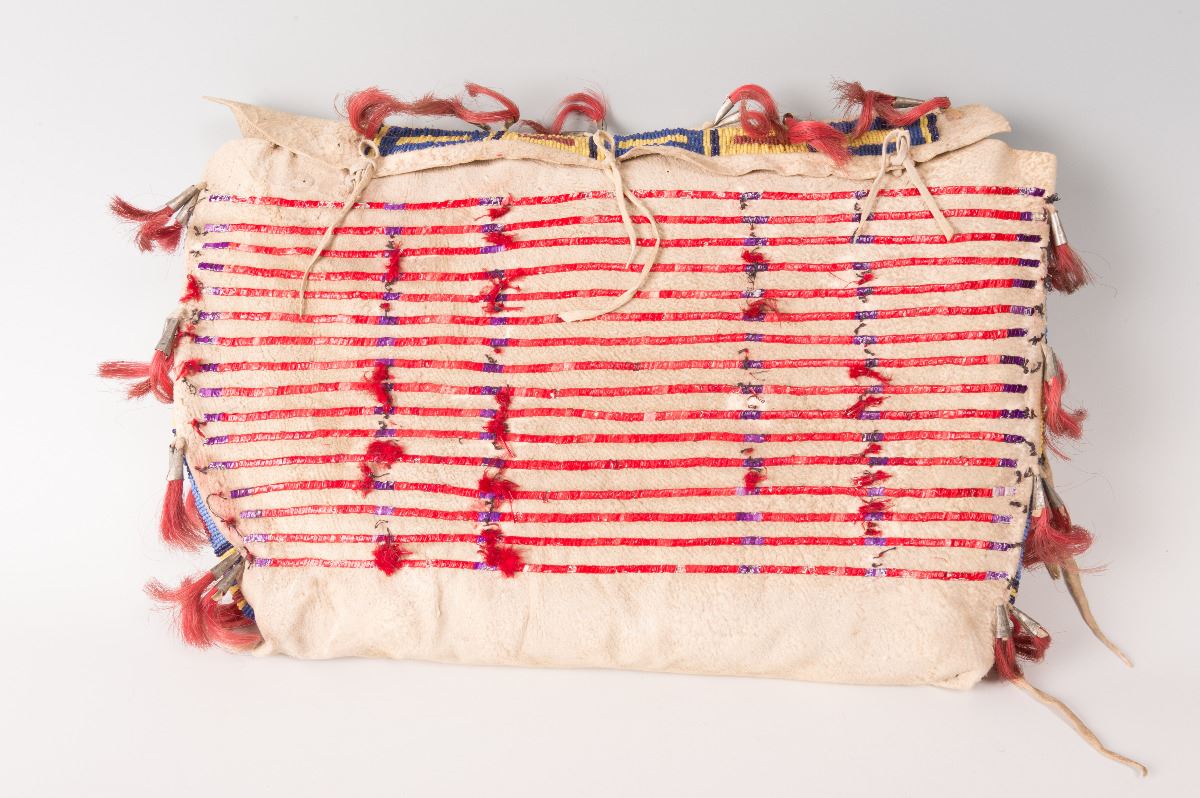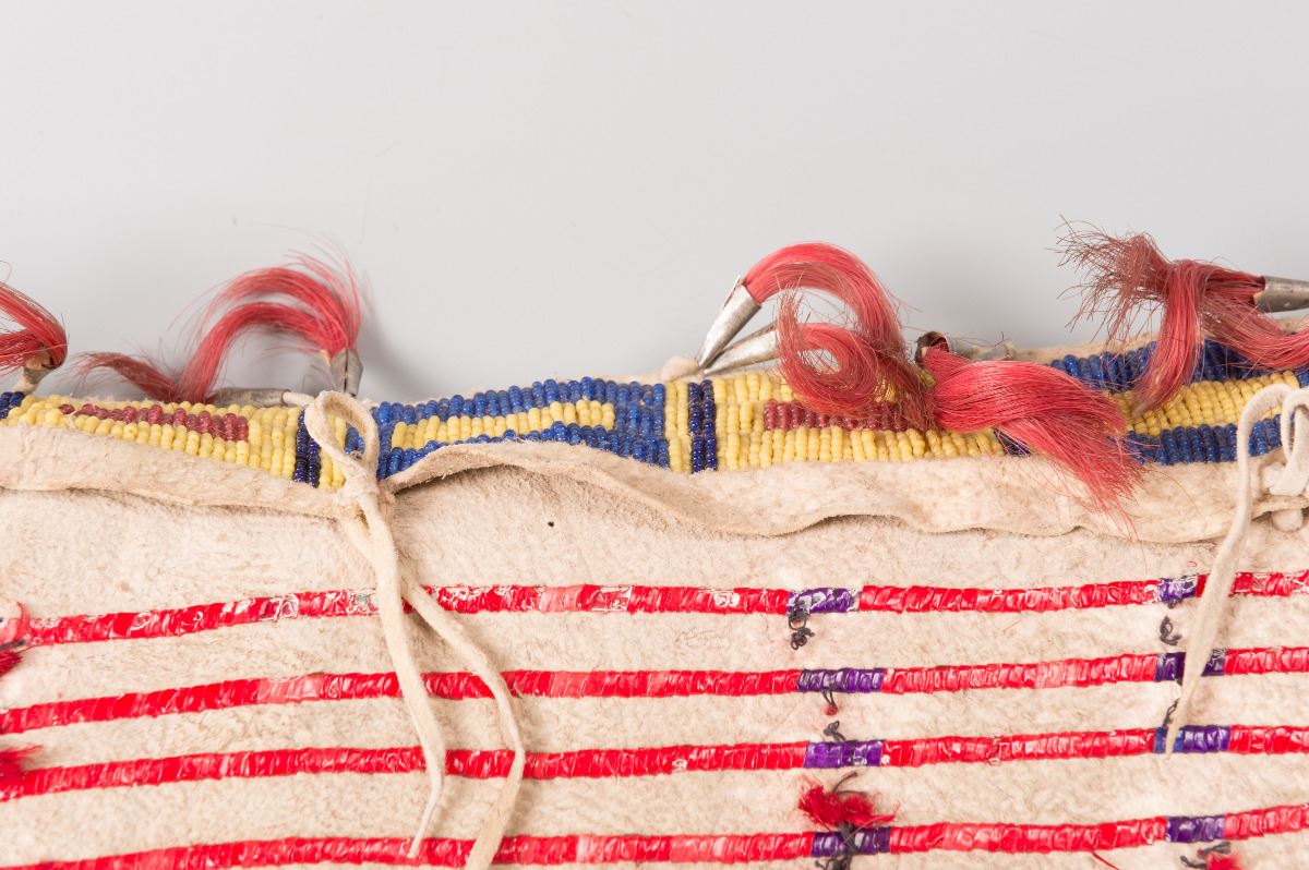 Sioux Quilled Teepee Bag. 12" tall x 18 ¾" wide. Line quilled with beaded ends, accented with dyed horsehair-stuffed tin cones and dyed chicken feathers. Circa 1890.