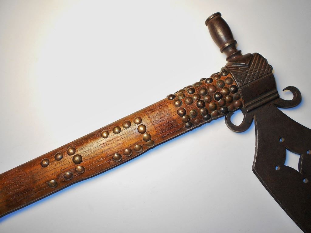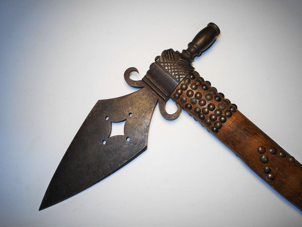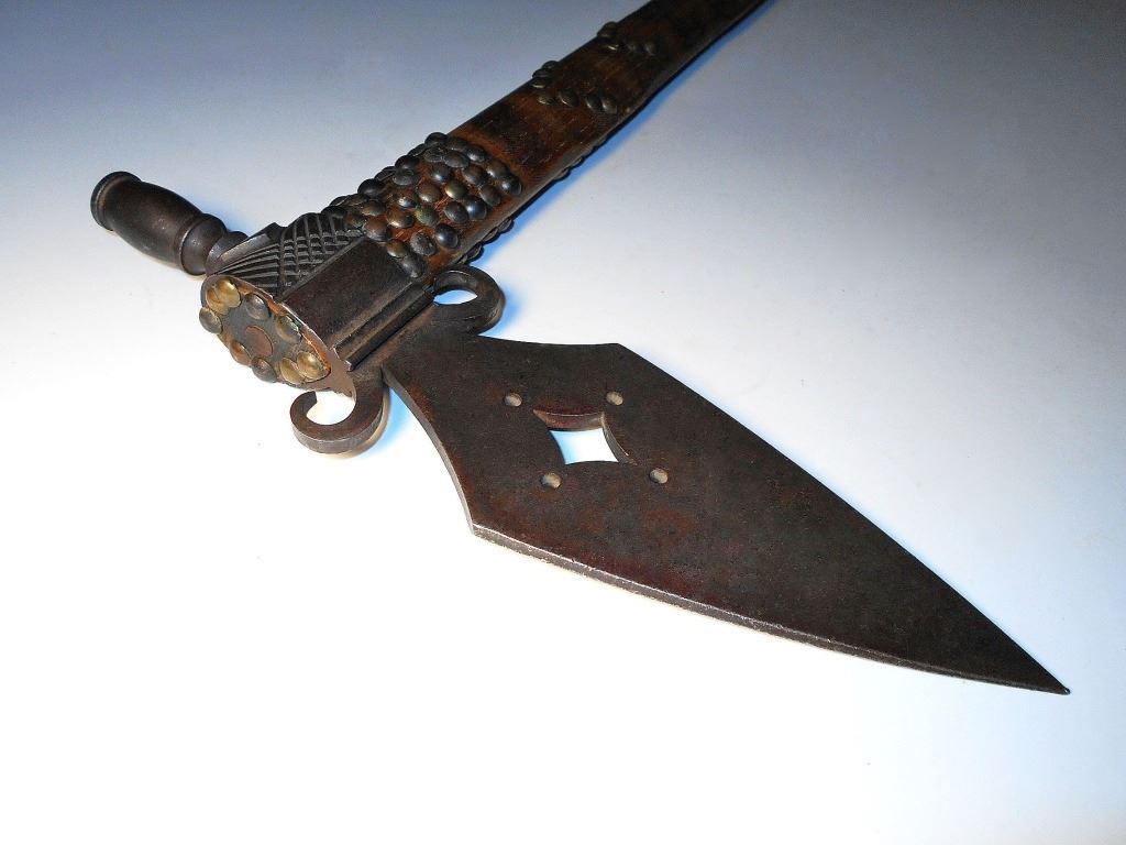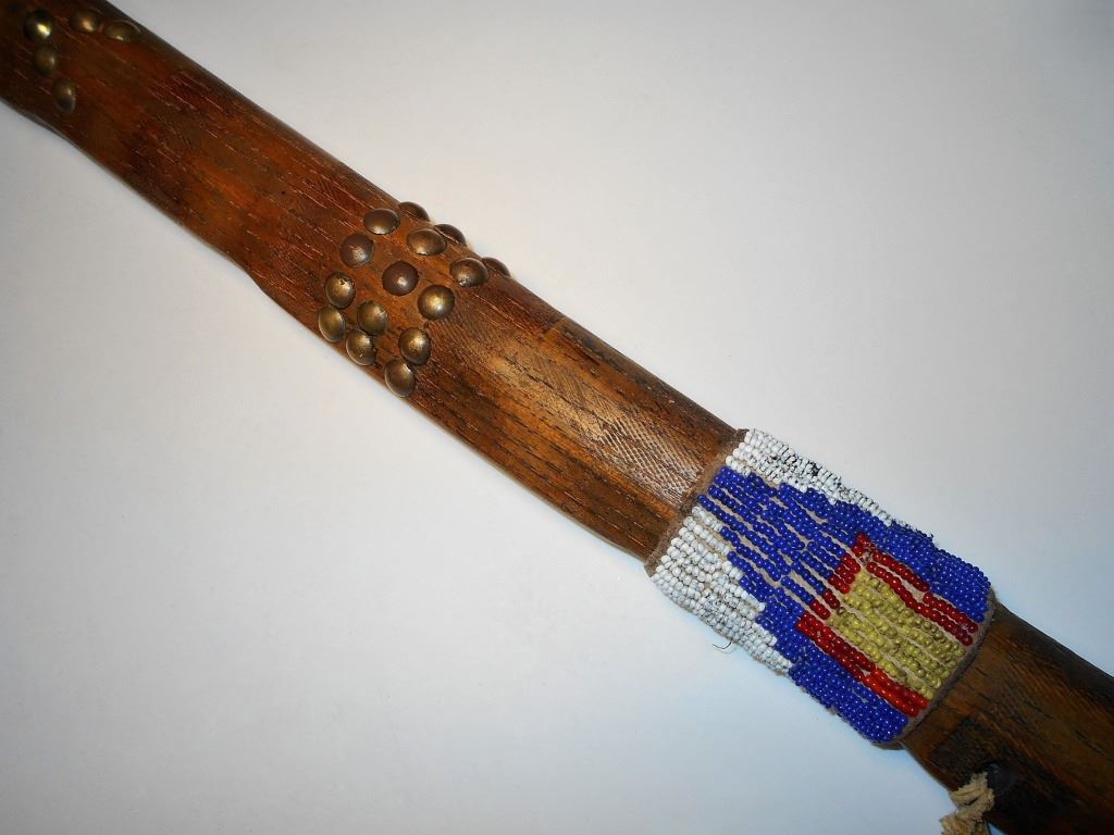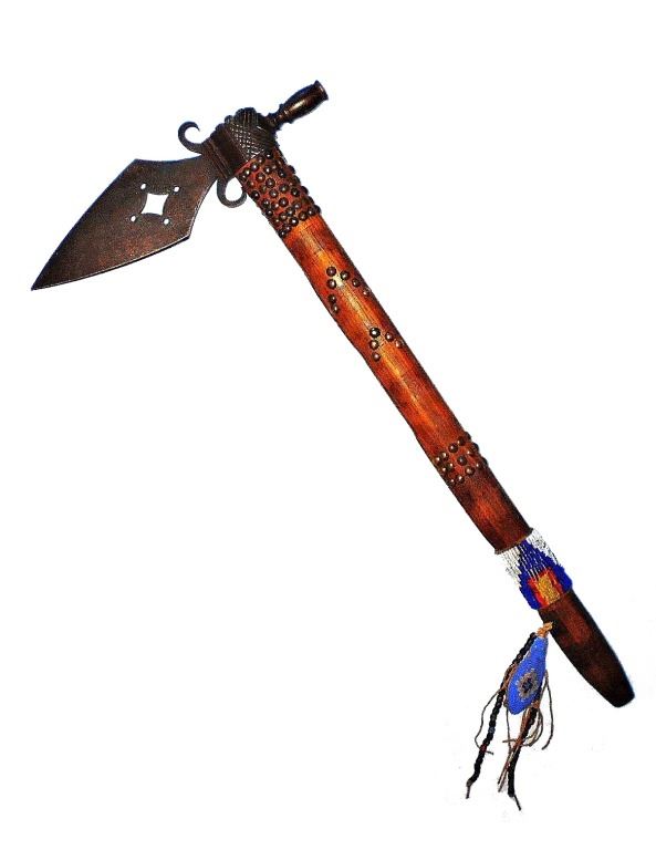 The lot features a wonderful spontoon pipe tomahawk attributed to the Sioux Native American Indians of South Dakota and dating to circa 1880’s. The piece was said to have been collected in South Dakota at the Pine Ridge Sioux Reservation and is from the ex-collections of Ted and Lilly Jarvis and Tom Hardy of Santa Fe, New Mexico and Ohio. The example shows large blacksmith forged iron spontoon blade head that features a four-point morning star cut out in the center which is surrounded by four pierced circles. The head also shows two upward-curled basal processes and exceptional file decoration on both sides of the eyelet hole. The haft handle has old faded hot file branding and brass trade tacks adorning the piece. On the right side of the haft shows brass trade tacks in a Buffalo Bison track design, a documented symbol said to symbolize ownership by a Warrior, as stated by Doug Diehl of Skinner Auctions and other experts. There is a beaded hide sleeve or wrap attached at the gripping area secured with old hide glue and a small dangle drop tied on at the pierced hole near the smoking tip. The drop is comprised of an old beaded fetish with two rows of tarnished brass beads. The beadwork at the gripping area shows all old glass trade seed beads in a geometric pattern with chalk white, greasy yellow, blue and red. The piece has a nice mellow patina and has some minor but expected wear from age and use. The head measures 12 inches long by 3 ¼ inches wide.