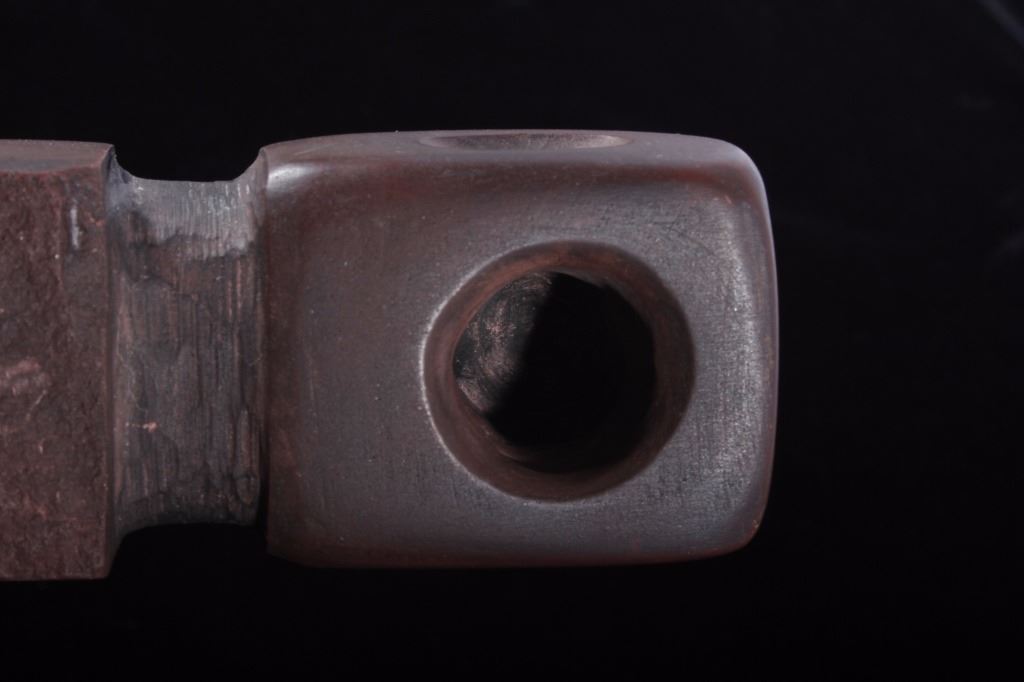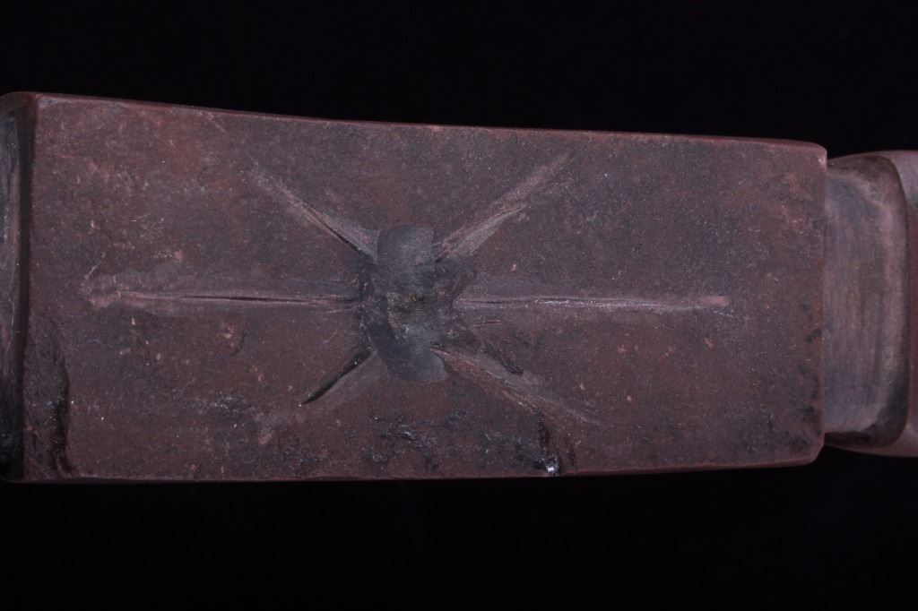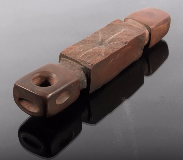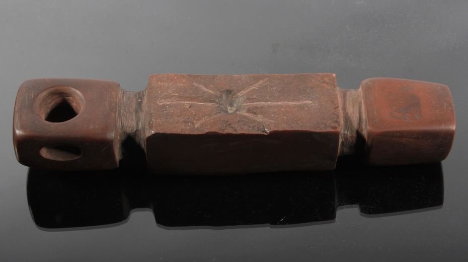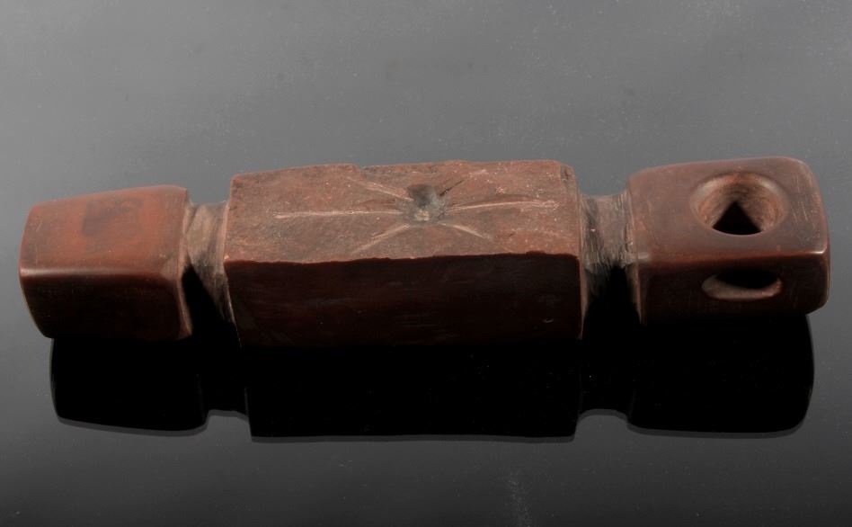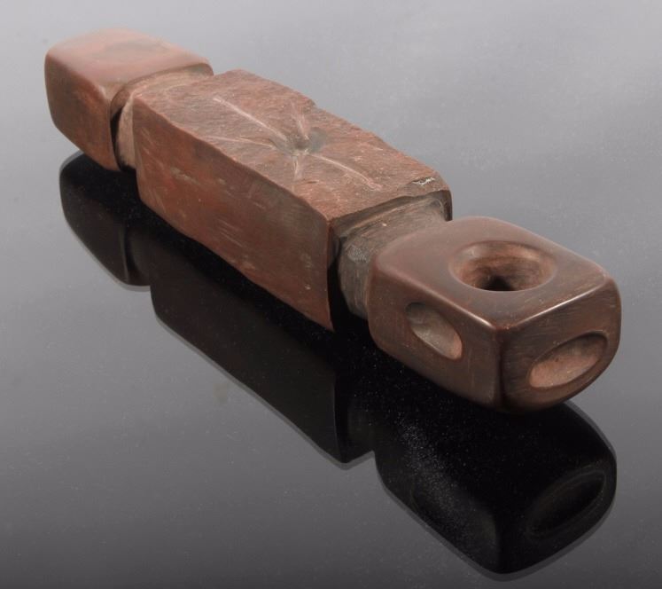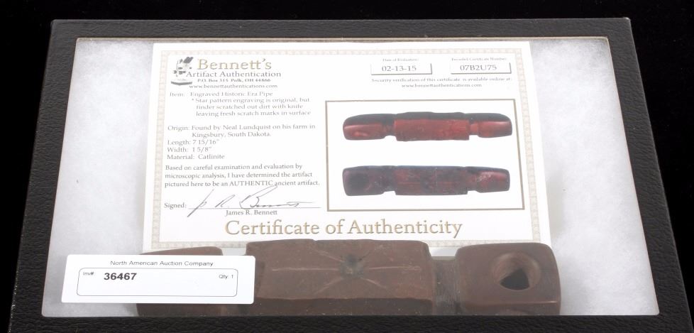 This is an authentic Sioux Native American Indian catlinite pipestone engraved star pattern pipe. The Engraved Historic Era Pipe shows a star pattern engraving and was found by Neal Lundquist on his farm in Kingsbury, South Dakota. The piece comes with a Certificate of Authenticity from Bennett's Artifact Authentication. The piece shows wonderful condition and is truly an excellent museum quality piece. Measures 7 15/16"L x 1 5/8"W x 1.5"H and comes in a 8.25"x12.25" glass top shadow box that is 2 1/8" thick.
