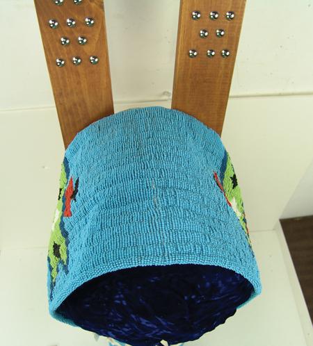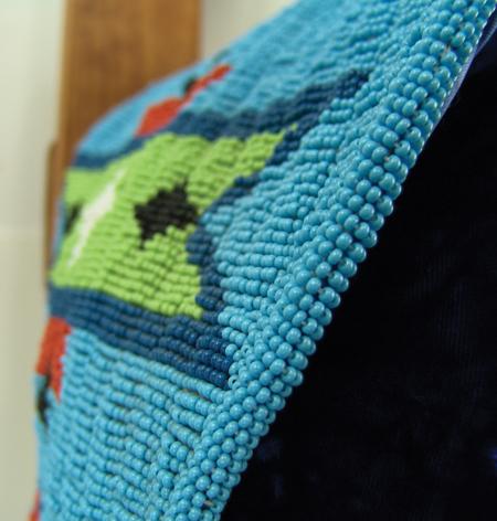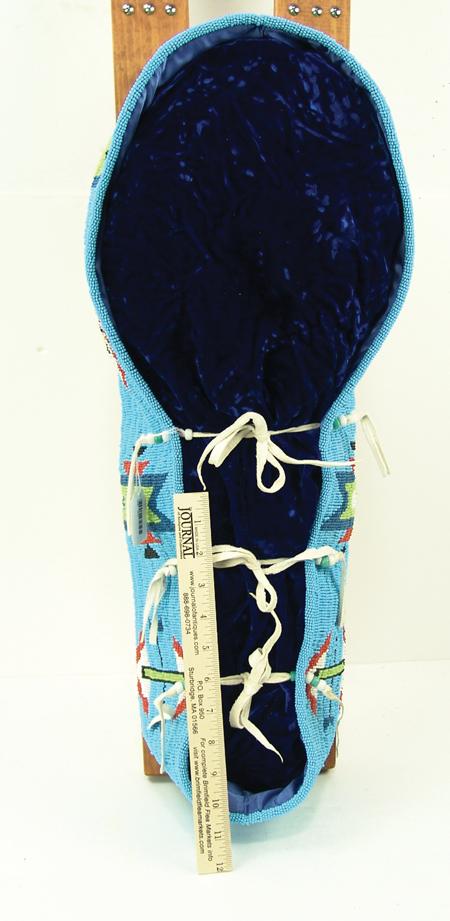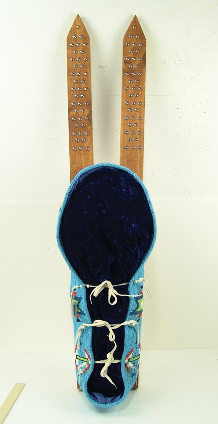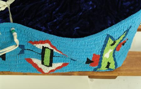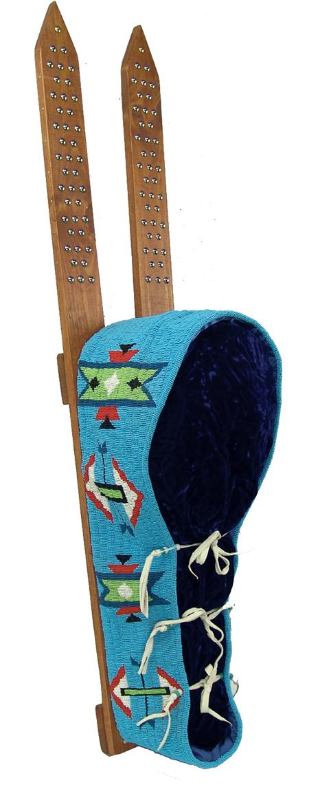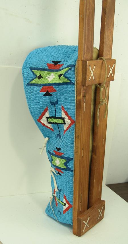 Circa 1970s, Fantastic full-sized soft-sided baby carrier completely covered with lazy stitch beadwork, attached to traditional brass tacked cradle "boards." Excellent condition. 45" x 9-1/2" x 10"