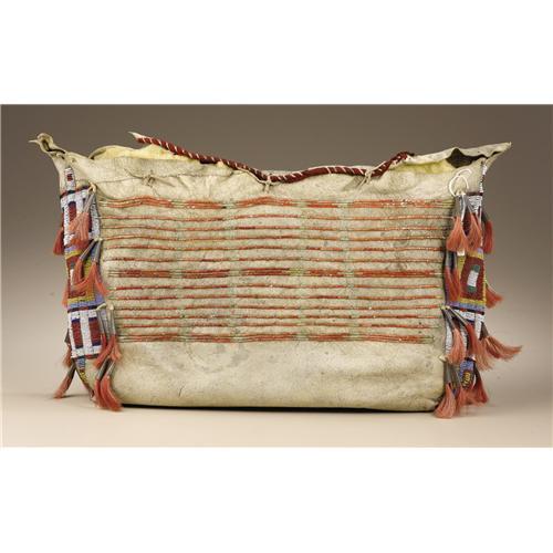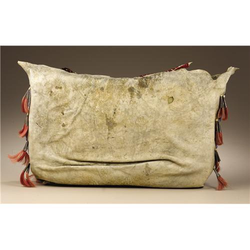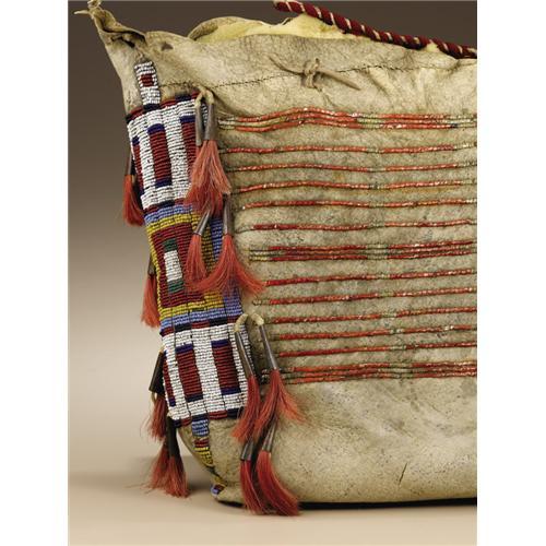 <B>Sioux Tipi Bag</B></I><BR>Circa 1875<BR>Length 13 1/2 in. Width 21 1/2 in.<BR><BR>This native tanned buffalo hide bag is decorated across the front with narrow horizontal bands of red and yellow dyed porcupine quillwork. The sides are beaded with wide panels using geometric patterns in red, green, yellow, blue, and white. The beaded area is edged with tin cones and dyed red horsehair accents.Tipi bags, sometimes referred to as storage bags or possible bags, were all purpose containers and were originally made in matched pairs.<BR><BR>Provenance<BR>Merrill Domas, Old Chatham, New York.<BR><BR> <BR><BR><B>Imp