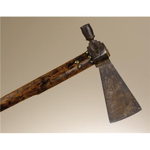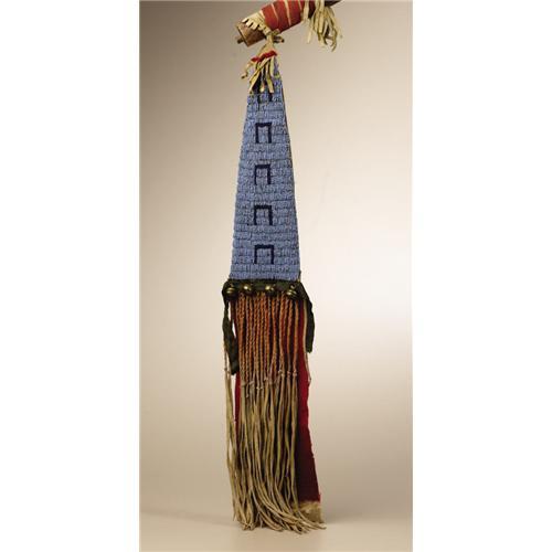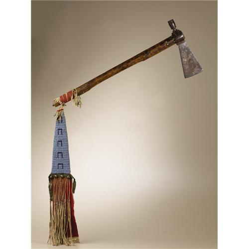 <B>Sioux Tomahawk, Beaded Pendant with Horsetrack Designs</B></I><BR>Circa 1870<BR>Length 46 in. overall; Length 9 1/2 in. the blade<BR><BR>This hand forged iron blade is of the classic western Plains form, likely fabricated from an old gun barrel. The blade is fitted to an ash wood handle decorated with nine brass tacks. A decorative beaded drop is secured to the handle by a section of fringed hide and red wool braid. The triangular shaped pendant is beaded with a series of horse tracks in navy blue against the light blue background. Twisted hide fringe, four brass hawk bells, and a piece of red wool trade cloth with white selvage finish the ornament. The hide is backed with calico.<BR><BR>Provenance<BR>Tom Haas, Riverton, Utah<BR><BR>