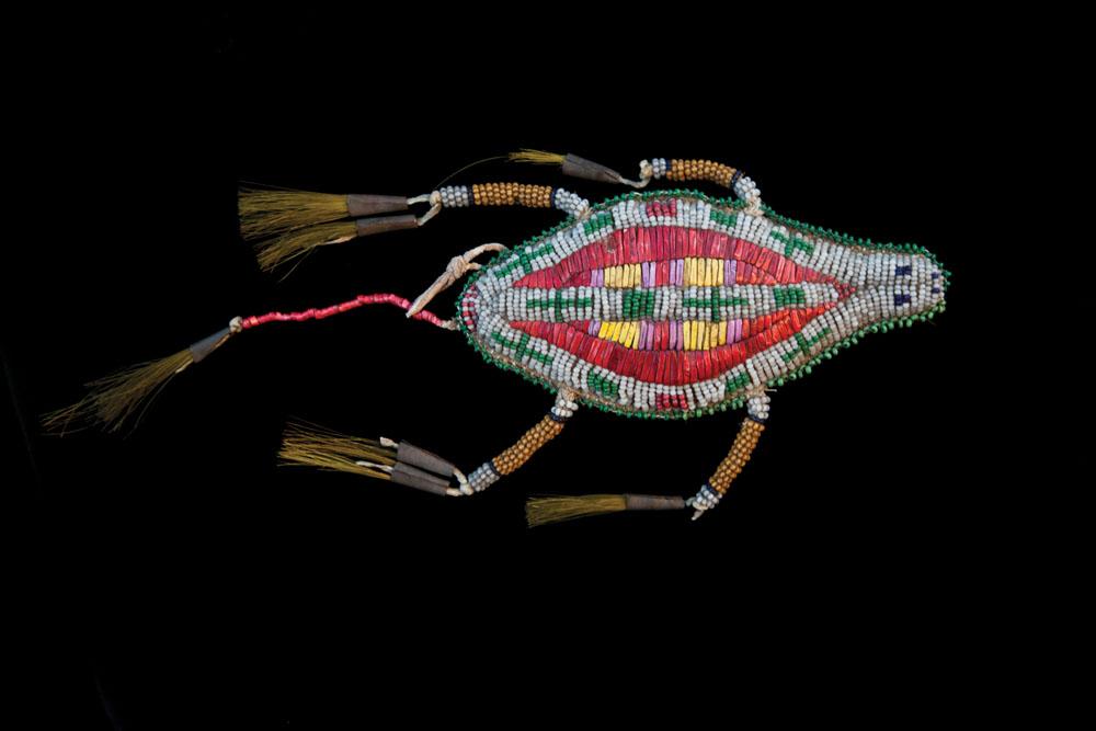Beaded edges of green crosses on white and quilled center in red, yellow, and purple. Dyed horsehair and tin cones on beaded legs and quilled tail. 5 1/2” x 2 3/4” not including the drop (tail). Fine condition with several missing cones, c. 1890.
