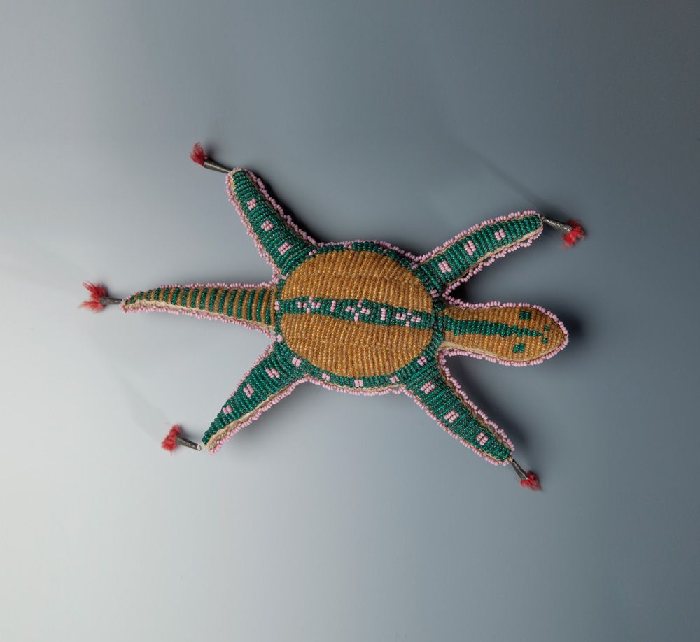 Sioux Turtle Fetish. Fully beaded top side in translucent green and yellow, with rose color edging and details. Further embellished with feather-stuffed tin cones, on native tanned hide. Circa 1920s, 10" x 5".