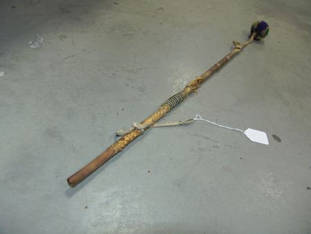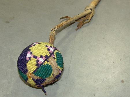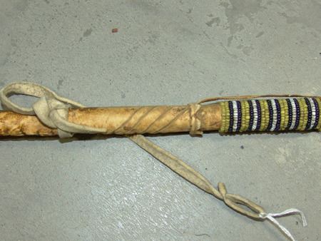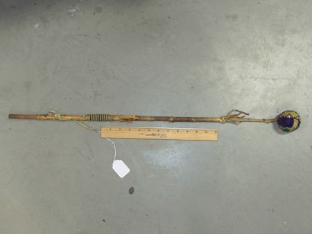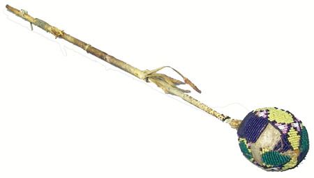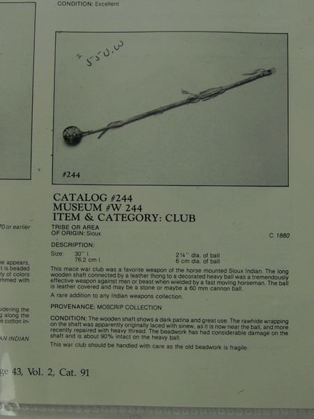 Late 1800s, Long handled "flop-knob" war club with sinew beaded ball and rawhide wrapped handle. Shaft snapped, but intact, with some early native repairs. Good condition. Ex. Holbert and Moscrip Collections. 30" long, ball 2-1/4" diam.