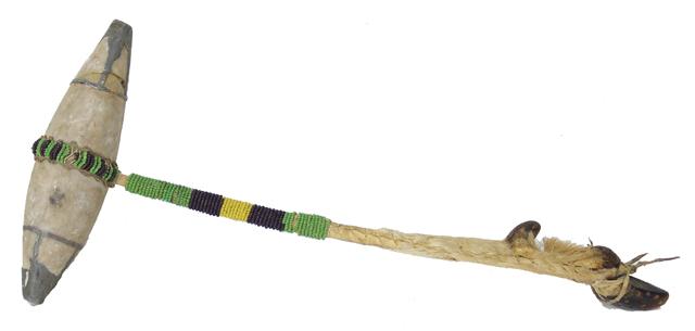 19th Century, Unusual old close combat war club comprised of a pewter inlaid stone head on a beaded antelope leg handle - ex. Penor collection. 16"