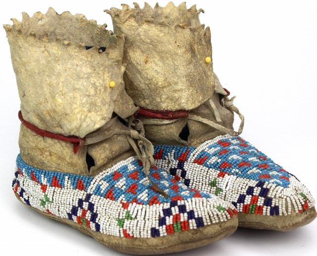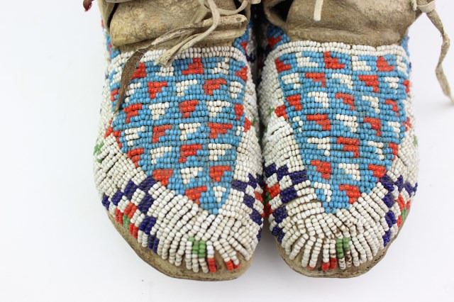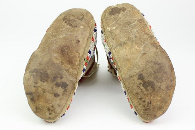 with fully beaded tripe pattern tops and hard soles, 6 1/2" X 5" tall, good to very good.