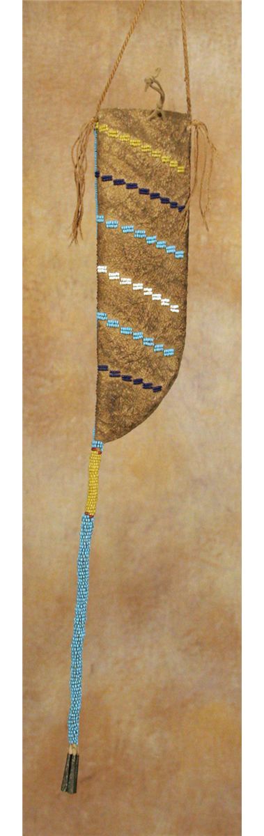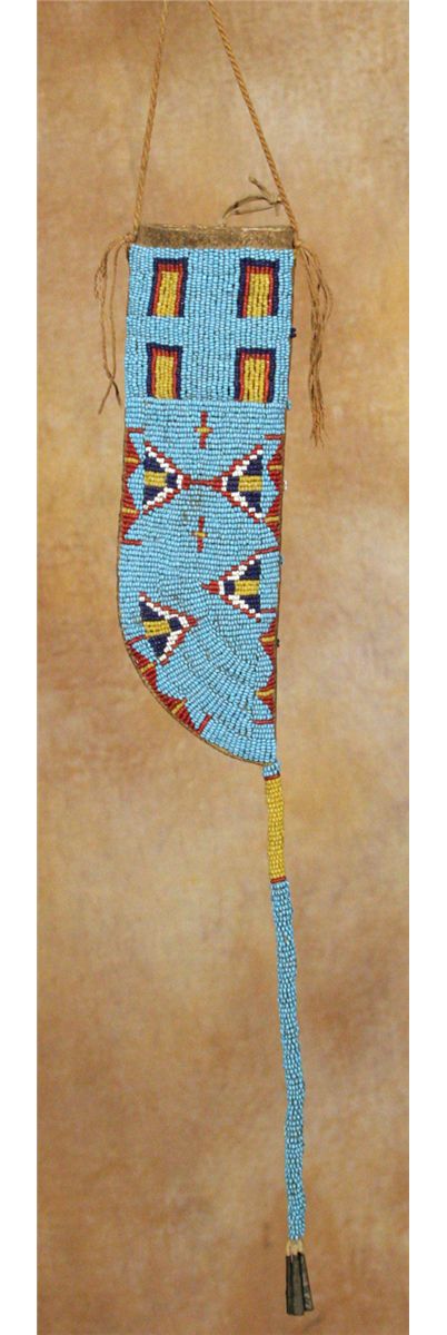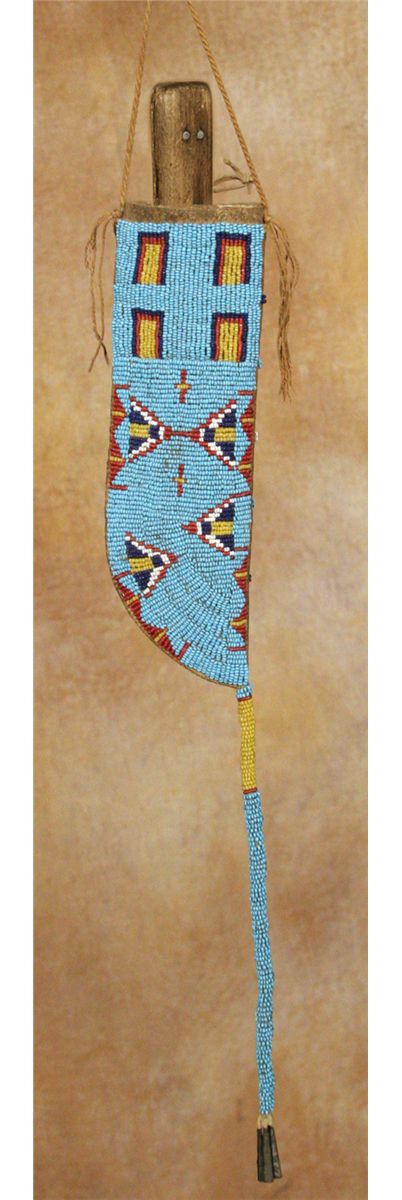 Sioux or Northern Cheyenne Knife Case. 9.25" long with a beaded 10" suspension, terminating in four tin cones. Fully beaded front and partially beaded back in classic colors and designs. Rawhide liner. 19th century. Provenance: Ex-Wintersteen collection.