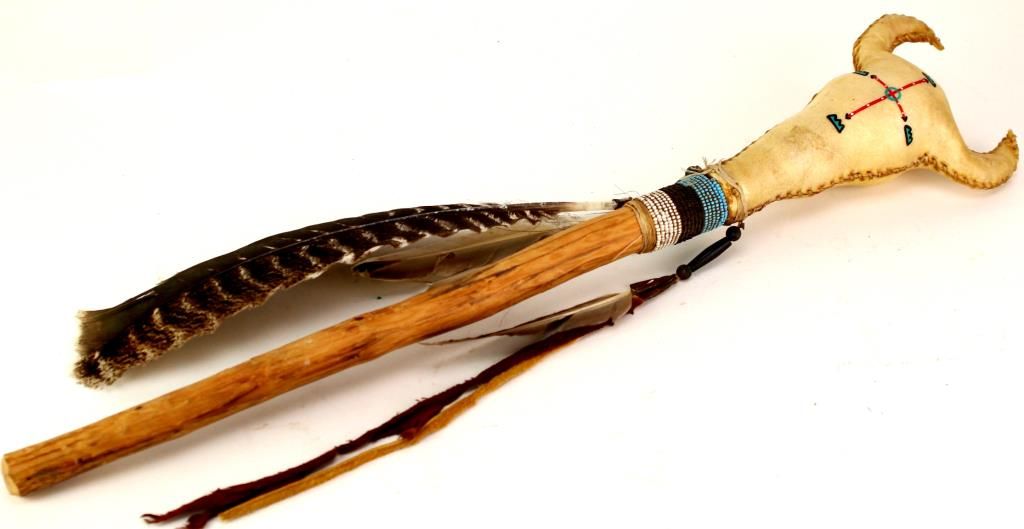 Sioux rawhide formed dance rattle 22" long with beaded handle and turkey feather drops, hand painted to the front.