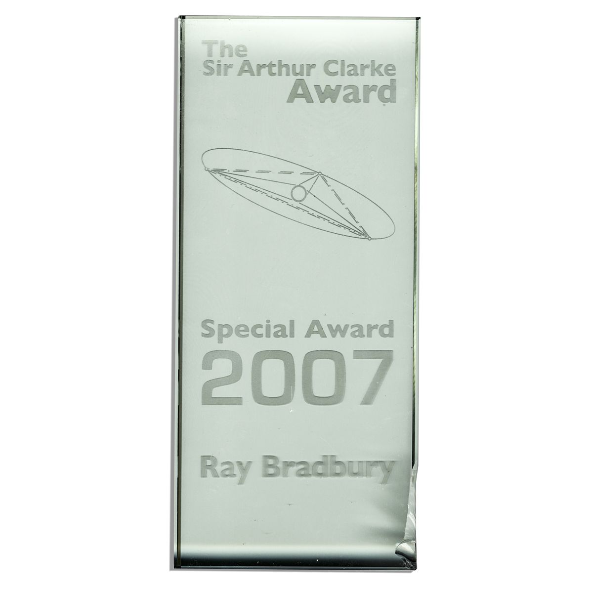 Ray Bradbury's Sir Arthur Clarke Award, a British award for contributions to space exploration. This ''Special Award'' was bestowed upon Bradbury in 2007. Green tinted glass block with beveled edges features etched text and design. Measures 3.75'' x 8.5'' x nearly 1''. Chip to lower right corner and a smaller chip to upper left, else near fine. With a COA from the Ray Bradbury estate.