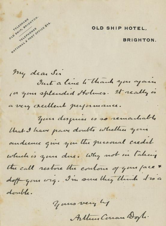 Exceptional Sir Arthur Conan Doyle autograph letter signed, “Arthur Conan Doyle.” Single page, octavo, on “Old Ship Hotel, Brighton” stationery. Written to actor Oliver Peters Heggie, best remembered for his role as the blind hermit who befriends the Monster (Boris Karloff) with wine and tobacco in “The Bride of Frankenstein.” In full: “My dear Sir / Just a line to thank you again for your splendid Holmes. It really is a very excellent performance. Your disguise is so remarkable that I have grave doubts whether your audience give you the personal credit which is your due. Why not in taking the call restore the contour of your face & doff your wig. I’m sure they think it is a double. / Yours very trly, / Arthur Conan Doyle.” “The Adventure of the Speckled Band” is one of 56 Sherlock Holmes short stories written by Sir Arthur Conan Doyle. First published in “Strand Magazine” in February 1892, Conan Doyle, who later revealed that he thought this was his best Holmes story, wrote and produced a play based on it. O.P. Heggie appeared as Sherlock Holmes in the 6-25 February 1911 production of “The Speckled Band: An Adventure of Sherlock Holmes” at London’s Strand Theatre. Conan Doyle had playfully listed in all programs since opening night that “C. Later” played the part of “Peters – a Butler.” In the play, Holmes disguised himself as the butler and his pageboy, Billy, was disguised as Peter’s young daughter, Amelia. In fact, the actor who portrayed Holmes was also Peters, but Conan Doyle wanted the audience to think that another actor was Peters. Heggie’s disguise as the butler was so good that Conan Doyle wished he had given Heggie the credit he deserved. In another letter he had asked Heggie if it were possible for him to quickly remove his disguise as he left the stage at the end of a scene. Evidently, he didn’t. Now, he asks the actor if he could reveal he was also the butler during the curtain call. The name “C. Later” continued to appear in the programs of future productions of “The Speckled Band.” A magnificent full page letter. Letters by Sir Arthur Conan Doyle referring to Sherlock Holmes are rare and sought after by collectors. The letter offered here, signed in full, is exceedingly desirable in that it is entirely about a Holmes play written by Conan Doyle, who desired to give additional credit to an actor’s performance as Sherlock Holmes. This is without a doubt the finest Arthur Conan Doyle letter we have ever encountered. Inconsequential light toning to margins, the text and signature remain dark and prominent. In fine condition.