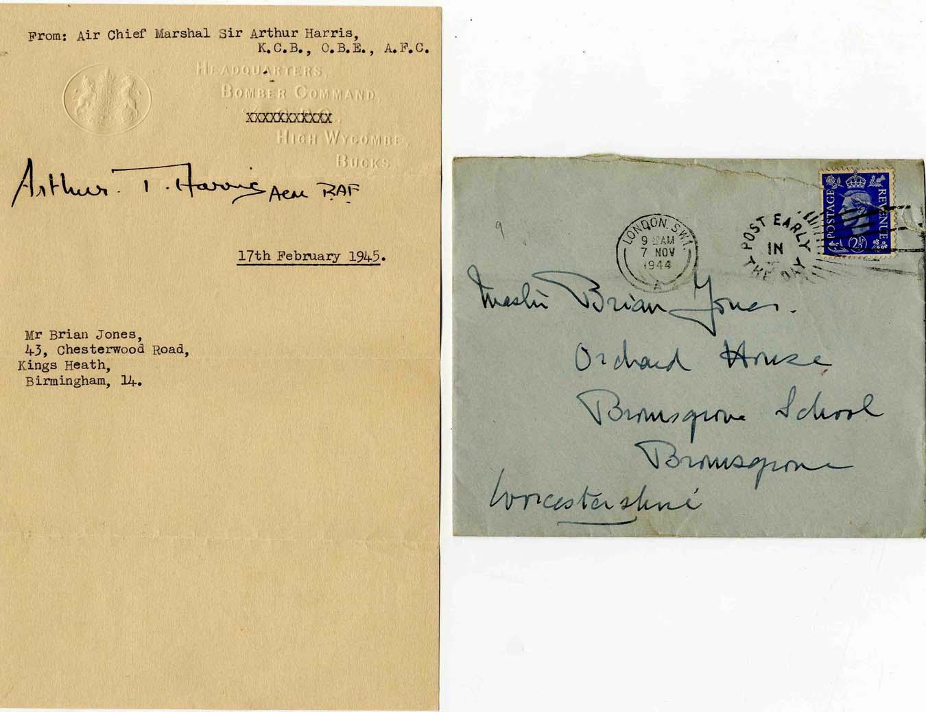 Note signed by British Air Chief Marshal Sir Arthur Harris. Signed boldly in black ink, ''Arthur T. Harris ACM RAF'' and dated 17 February 1945. The note bears the stamped royal seal and is embossed ''Headquarters, Bomb Command, c/o C.P.O., High Wycombe, Bucks.'' Addressed to Mr. Brian Jones in Birmingham, England. 4.75'' x 7.5'' note is folded in fourths and through the signature, which is still pristine. Near fine condition. With postmarked transmittal envelope.